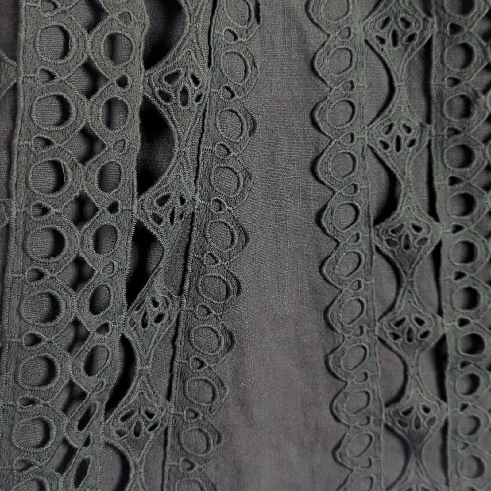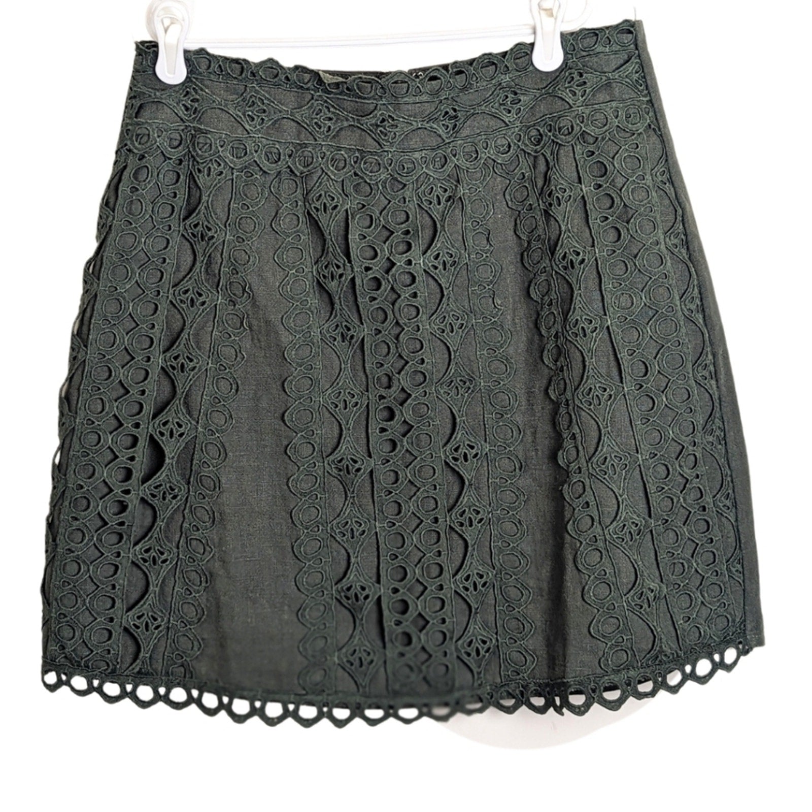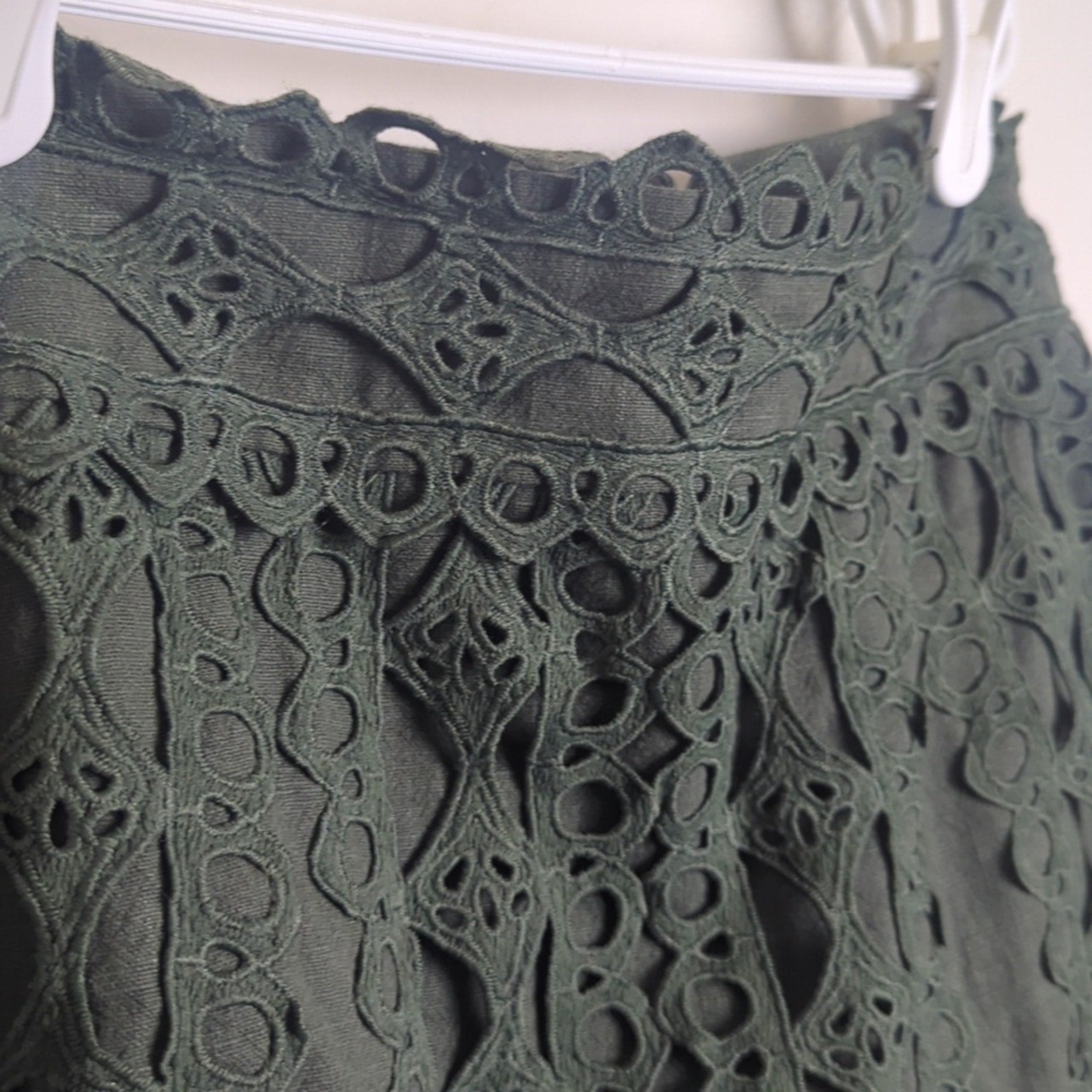 Boho crouchet eyelet cutout detail along the front. Zipper and clasp closure on the back.
