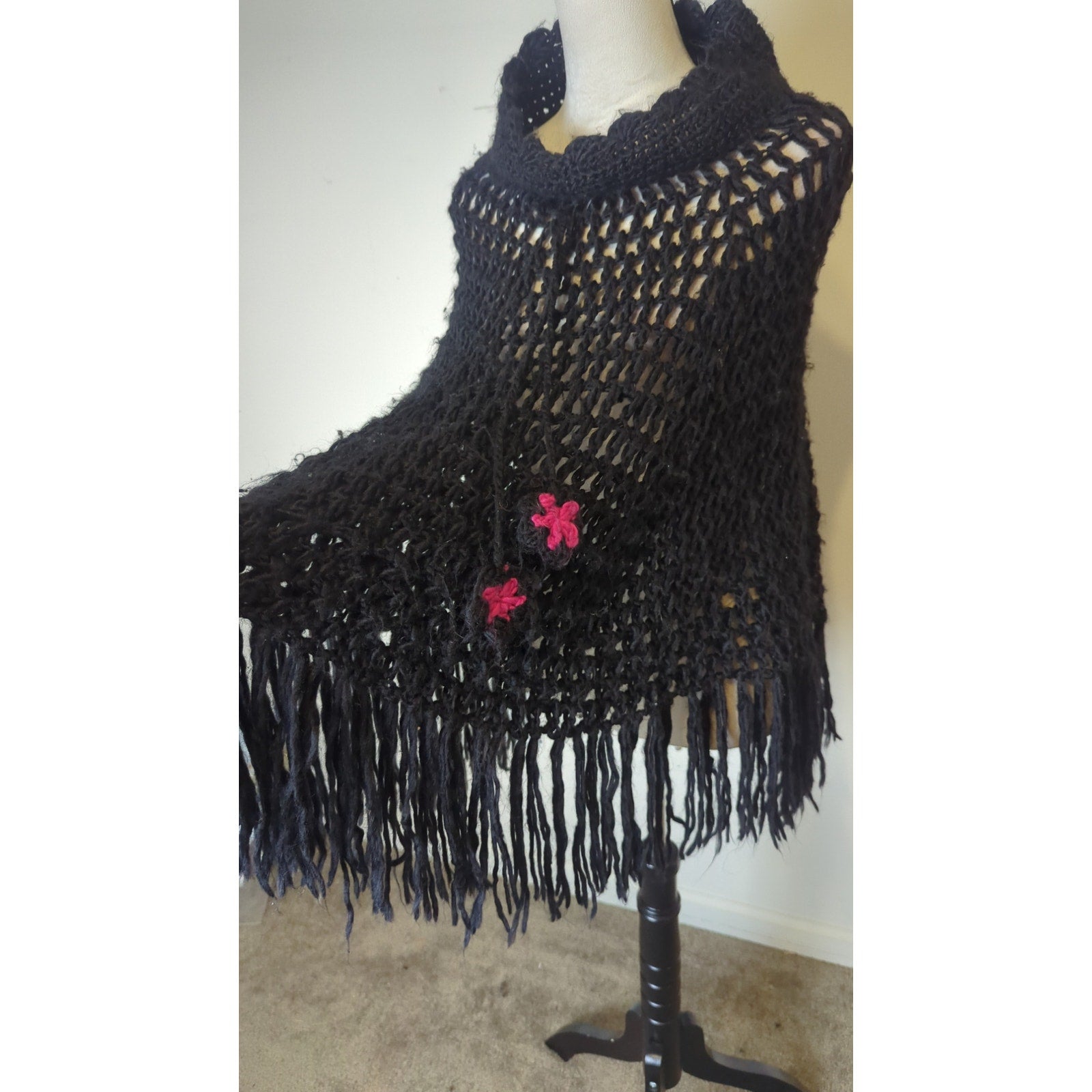 Fairy Grunge Black Open Knit Fringe Poncho Women's Medium
