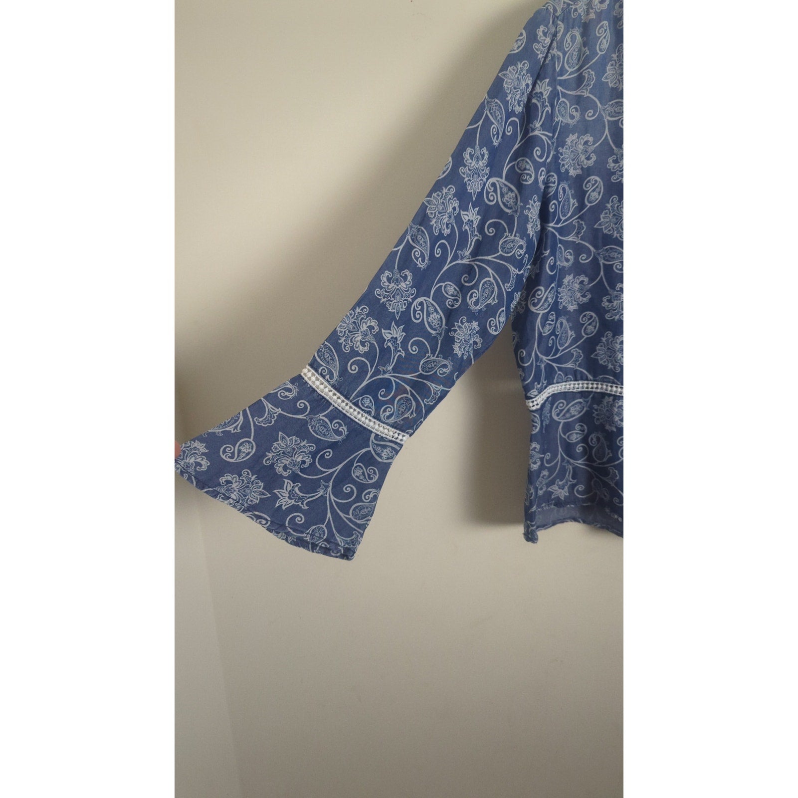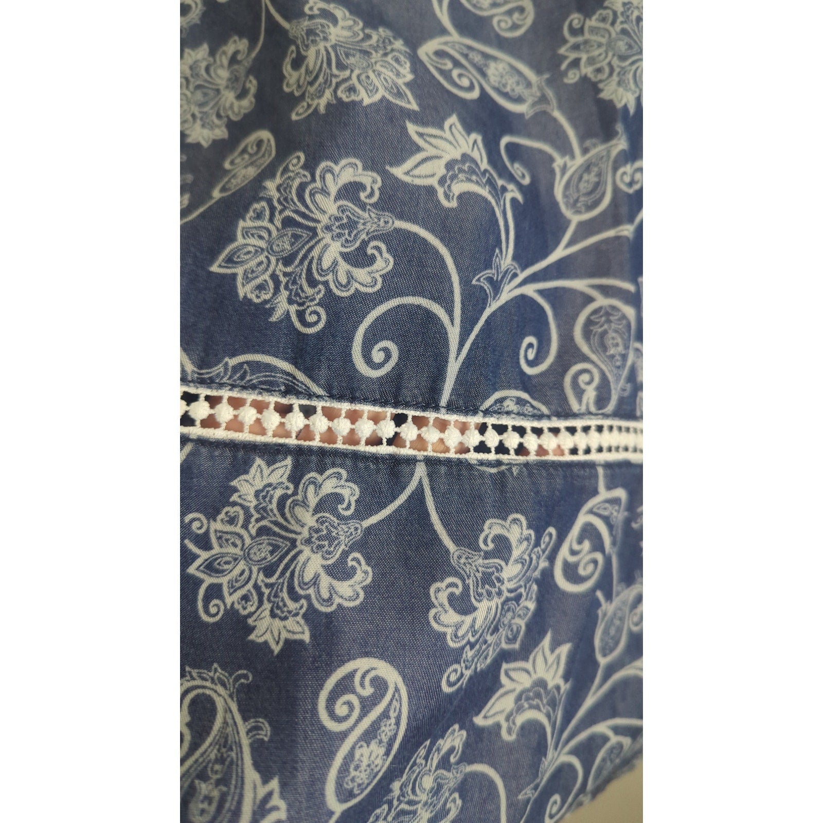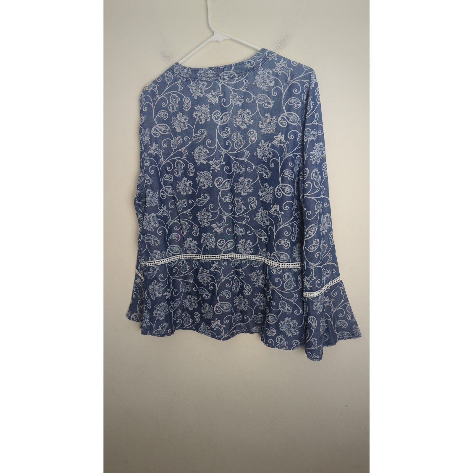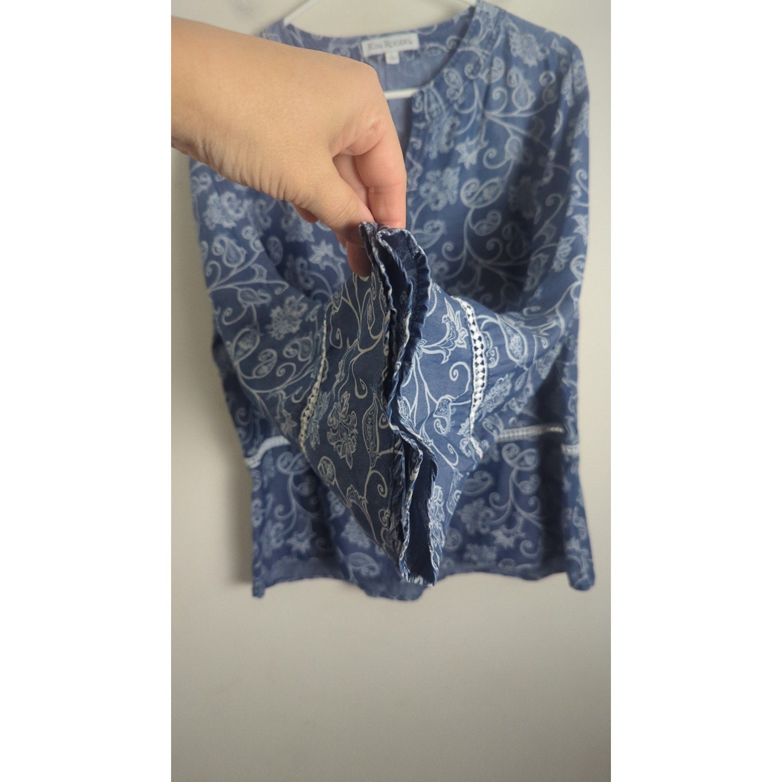 Beautiful lightweight chambray Whimsical pullover top with flared sleeves and Ladder embroidered stitching