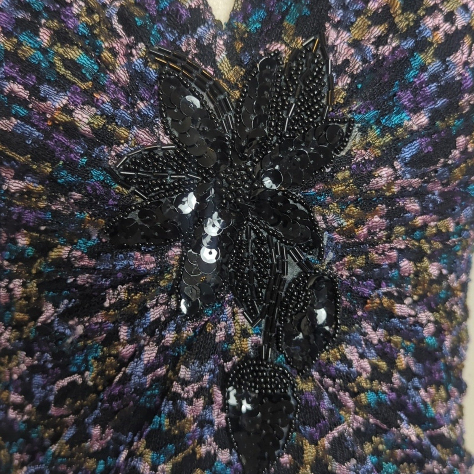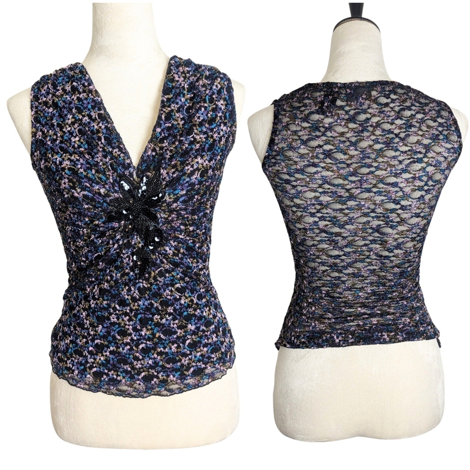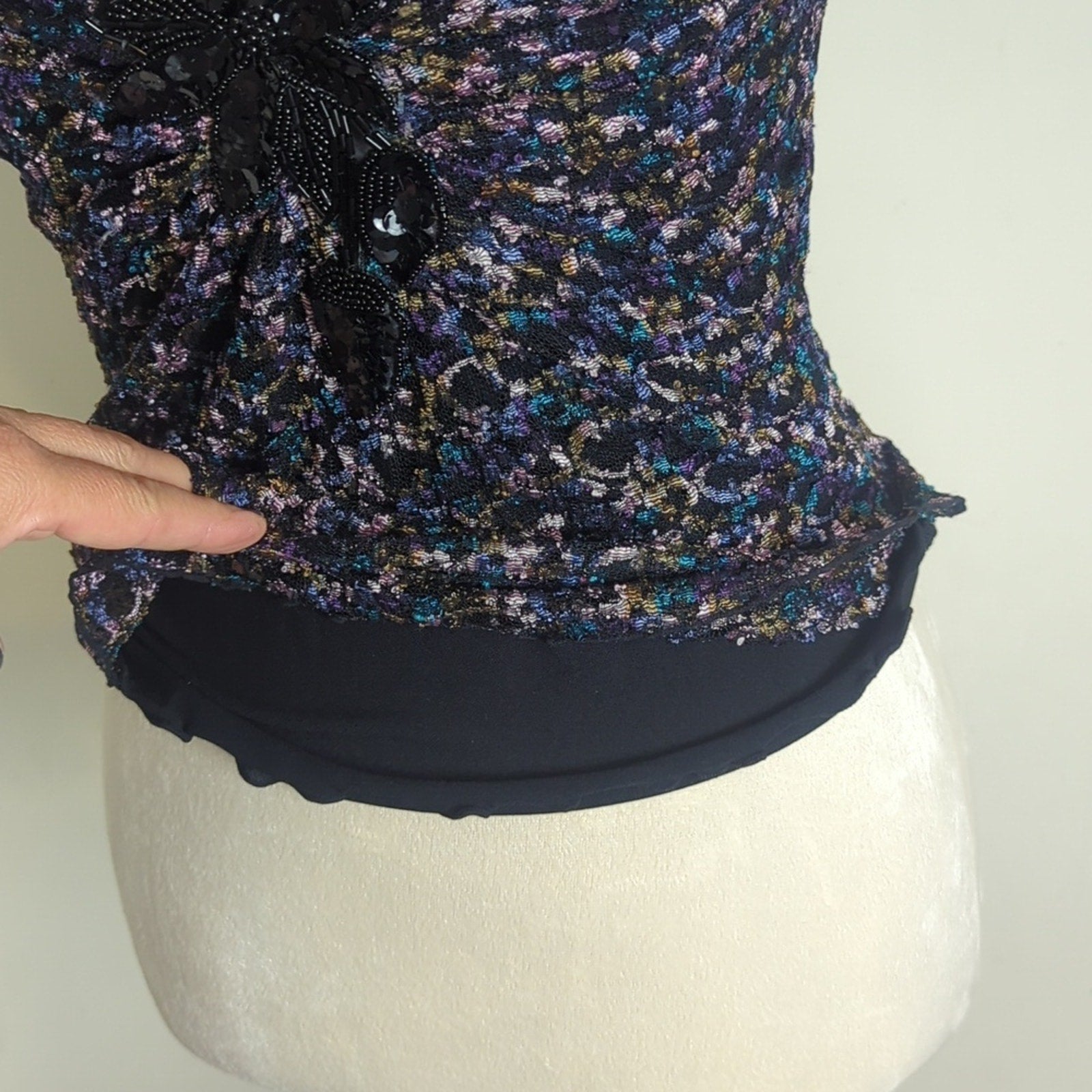 Whimsical stretch lace embroidered top with lining on the front and shear on the back. Large floral beaded embellishment at neckline.