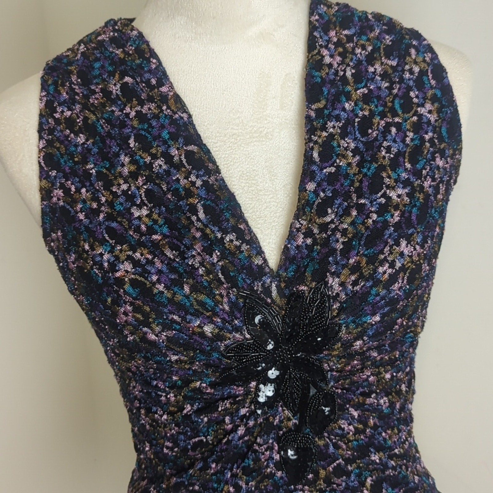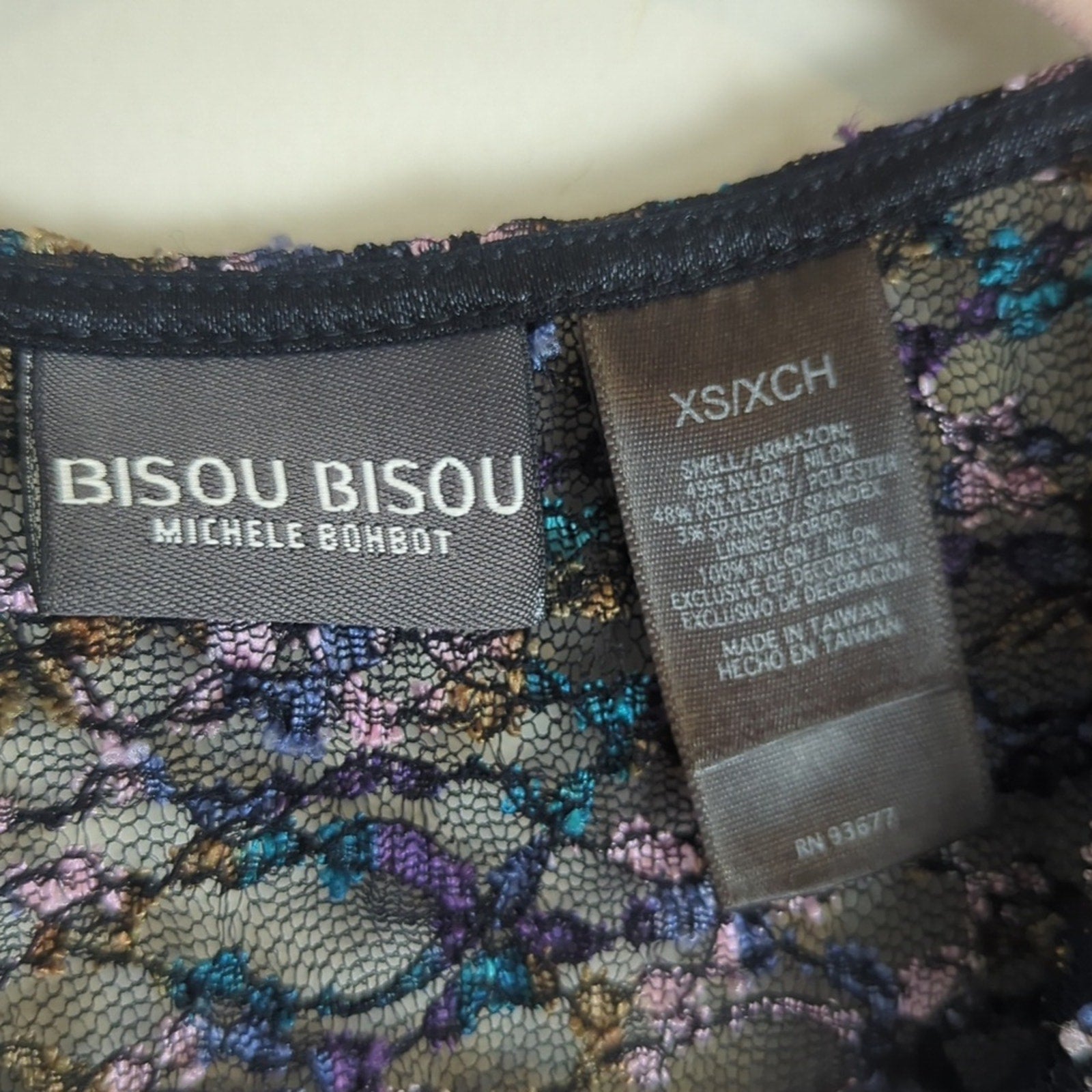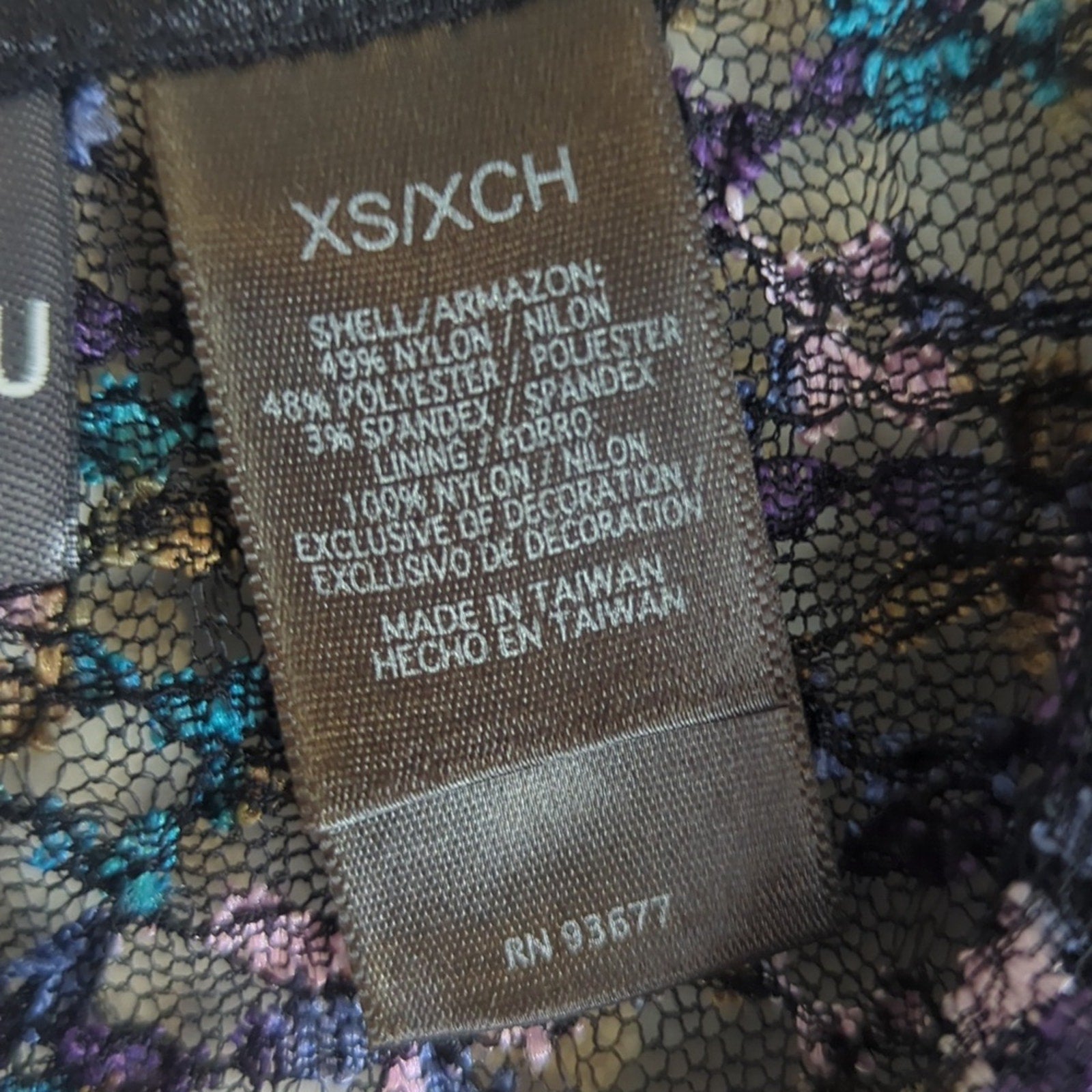 Whimsical stretch lace embroidered top with lining on the front and shear on the back. Large floral beaded embellishment at neckline.