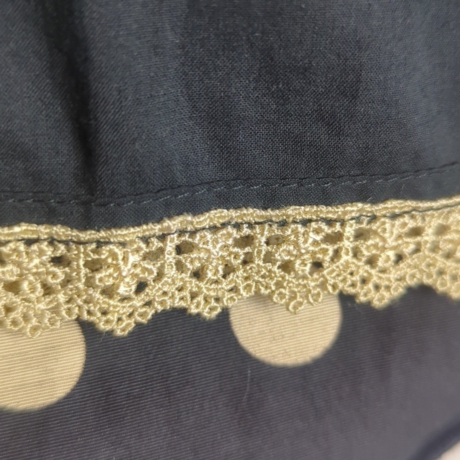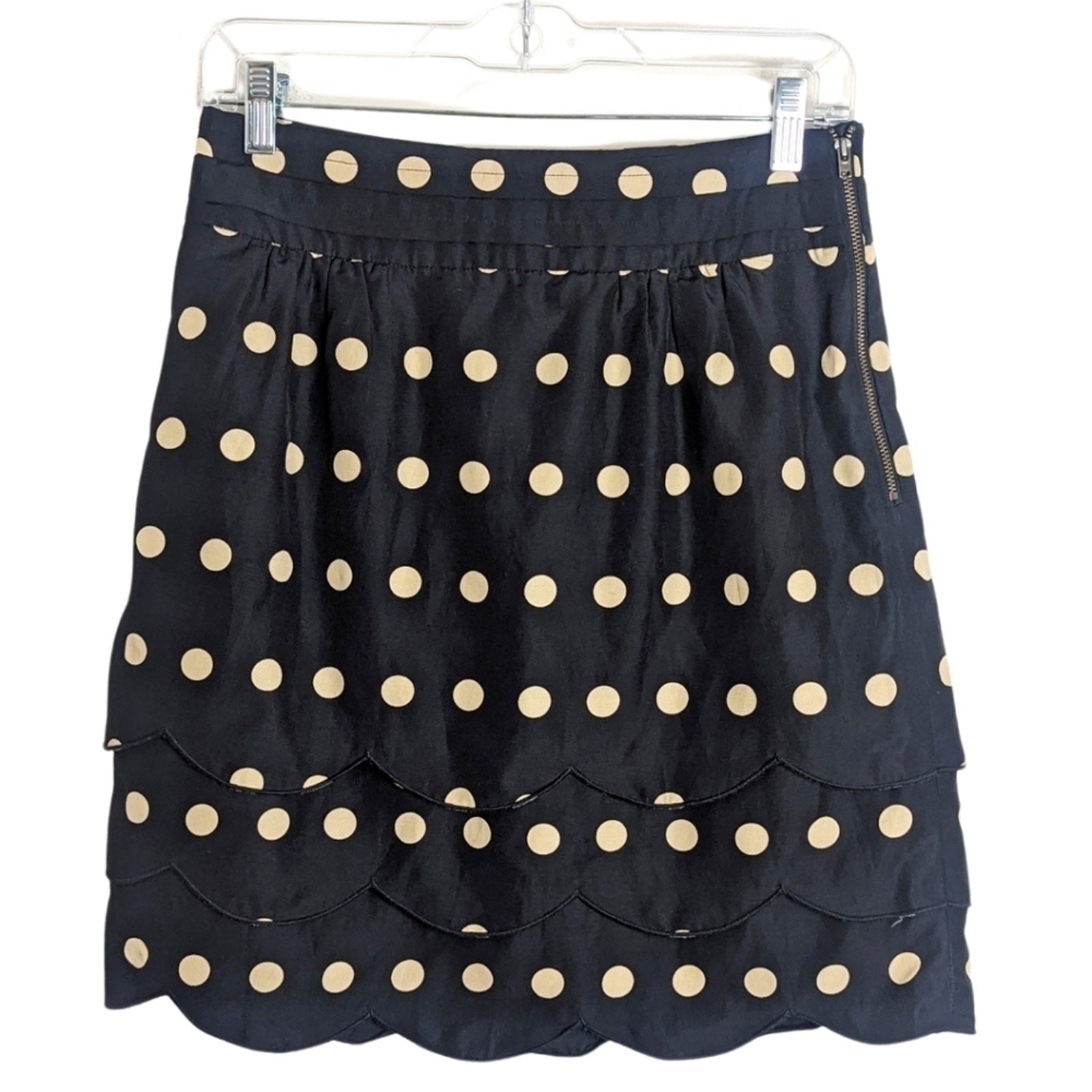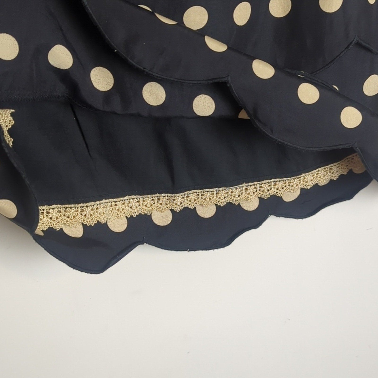 So many details! Three-Tiered scallop hemline on a polka dotted fabric of cotton and silk. The liner is 100% cotton with an antique lace hemline. Side exposed zipper closure , wide wasteband with flattering pleating.