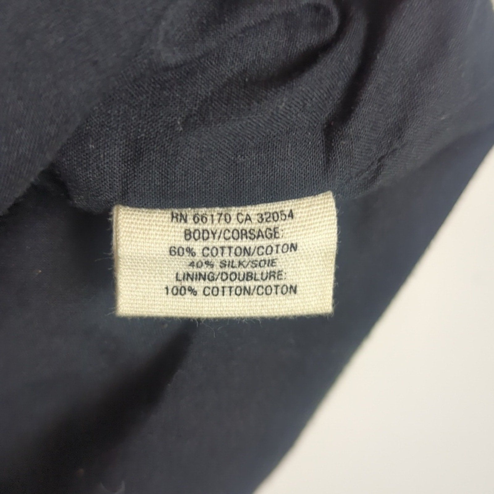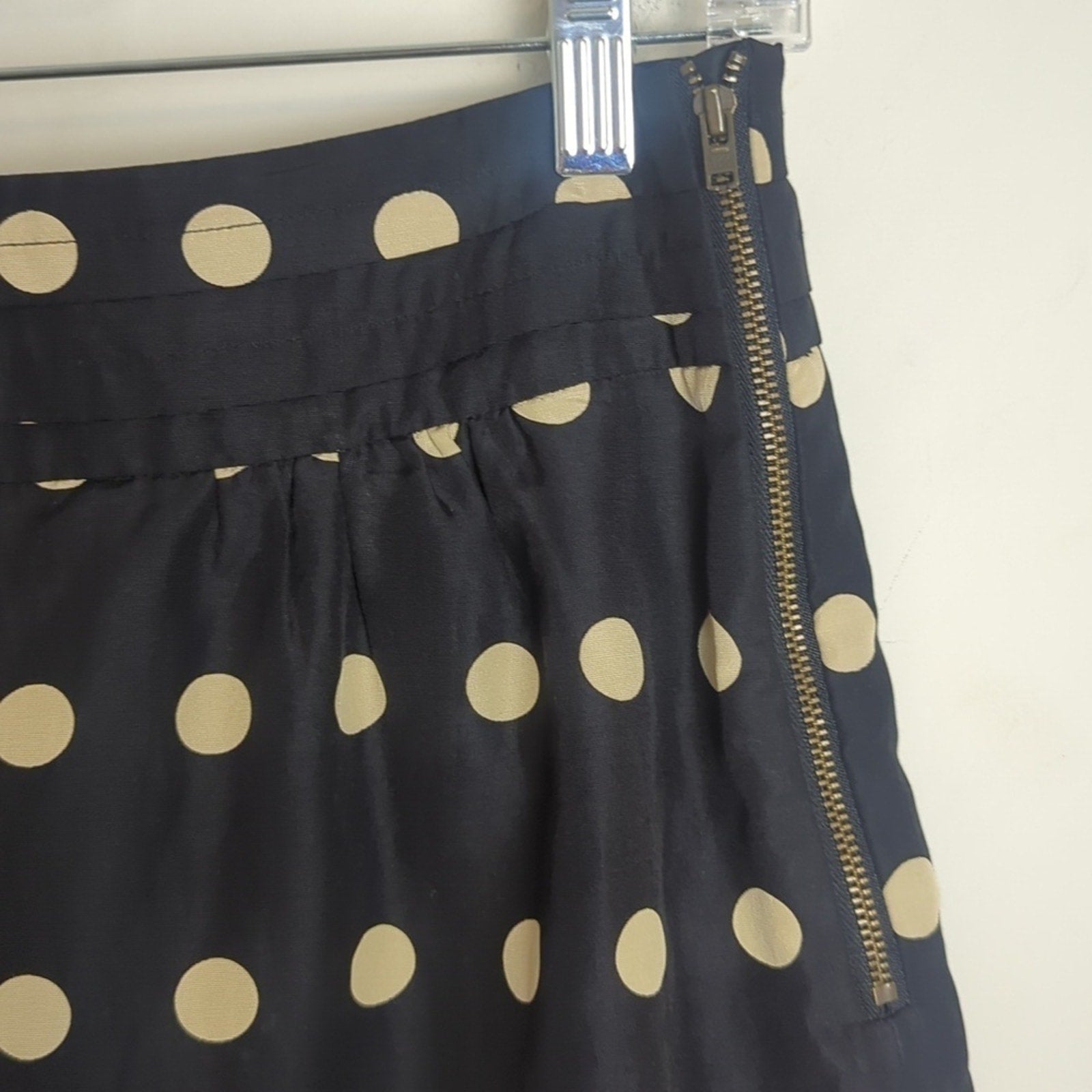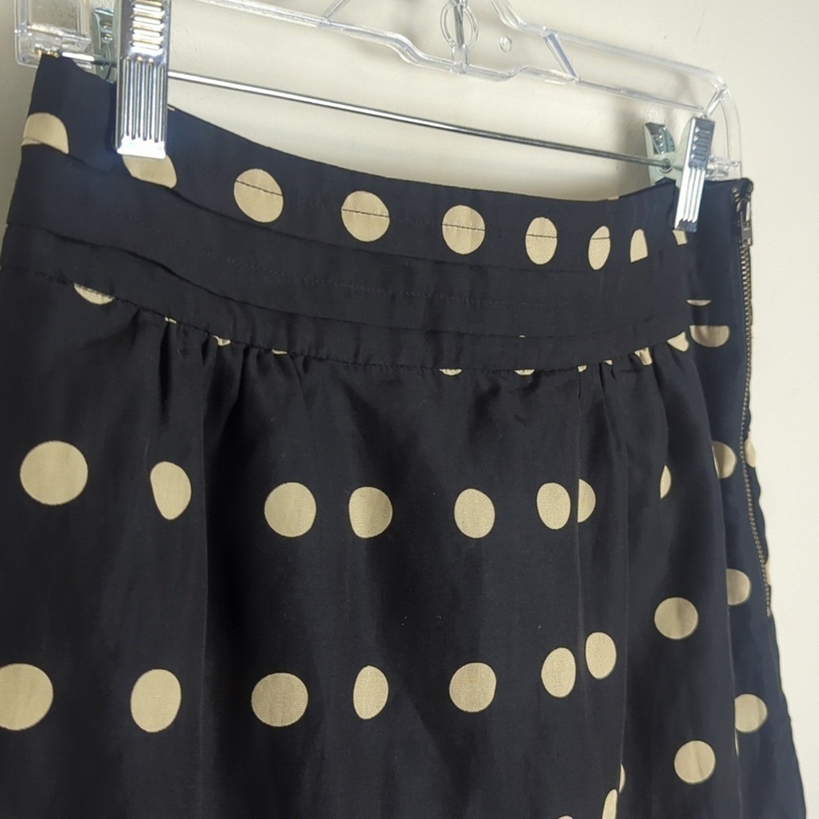So many details! Three-Tiered scallop hemline on a polka dotted fabric of cotton and silk. The liner is 100% cotton with an antique lace hemline. Side exposed zipper closure , wide wasteband with flattering pleating.