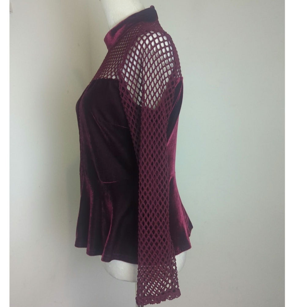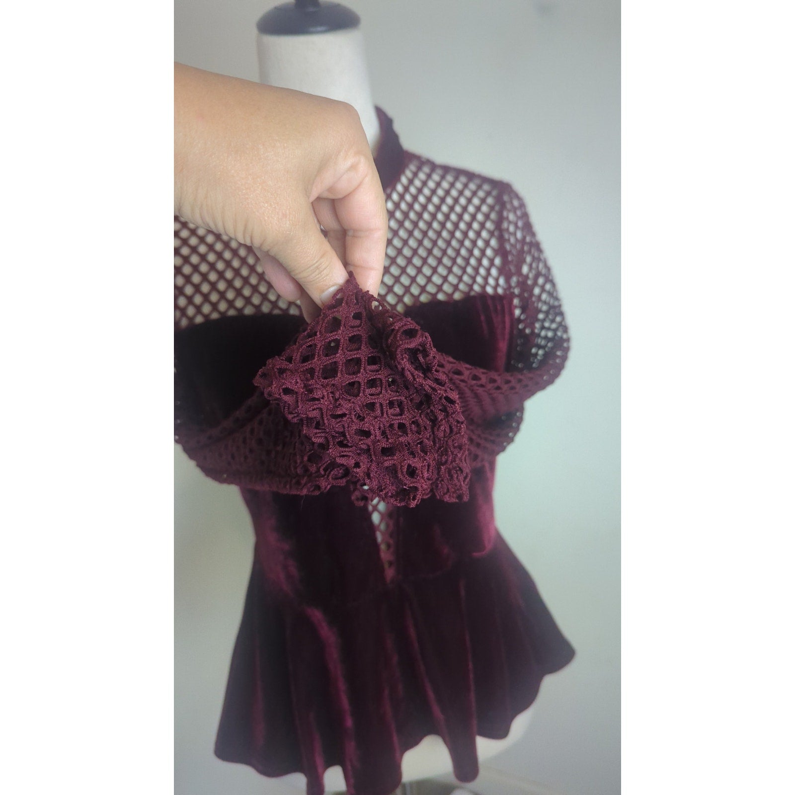 Glam Goth Fishnet Mockneck Red Velvet Peplum Top Large