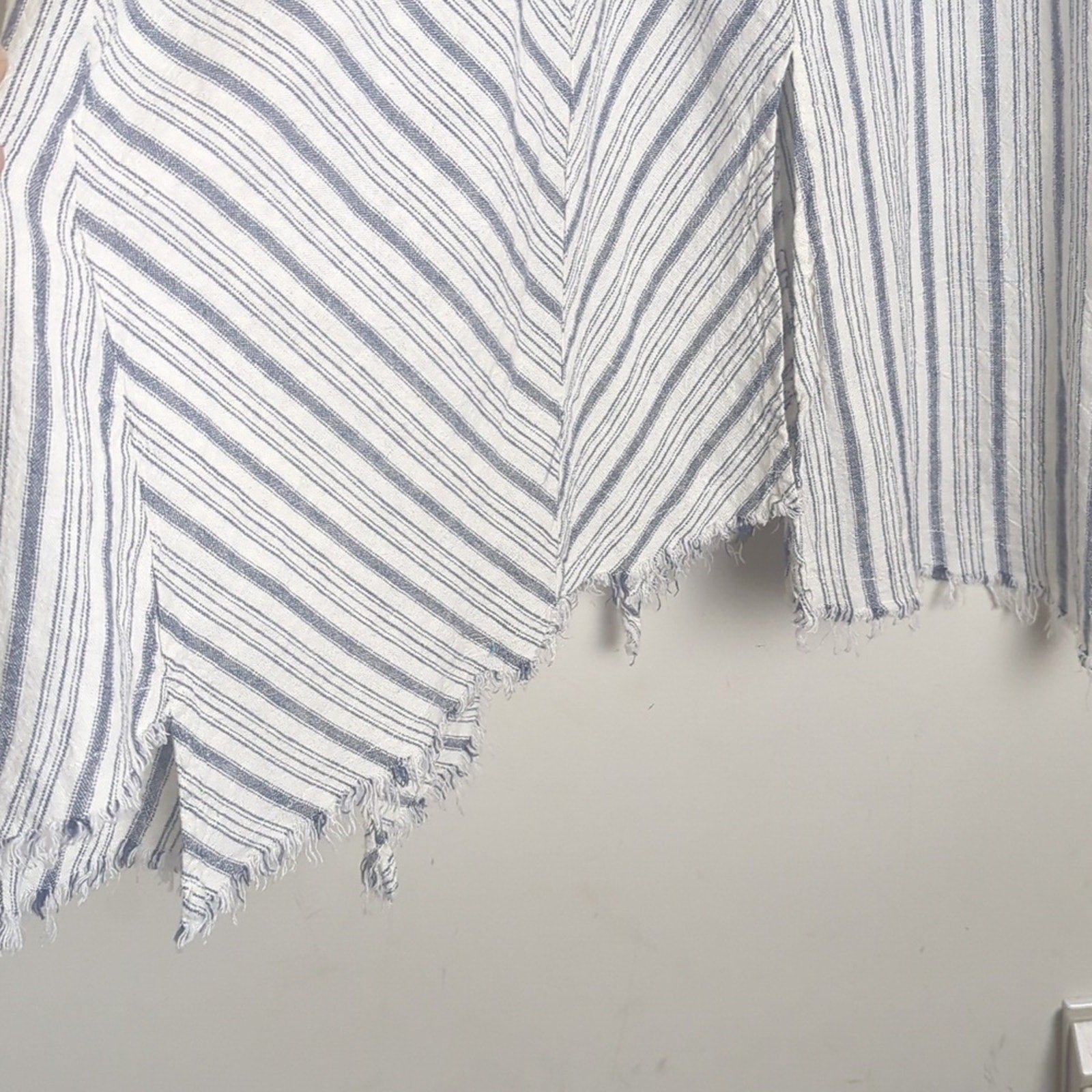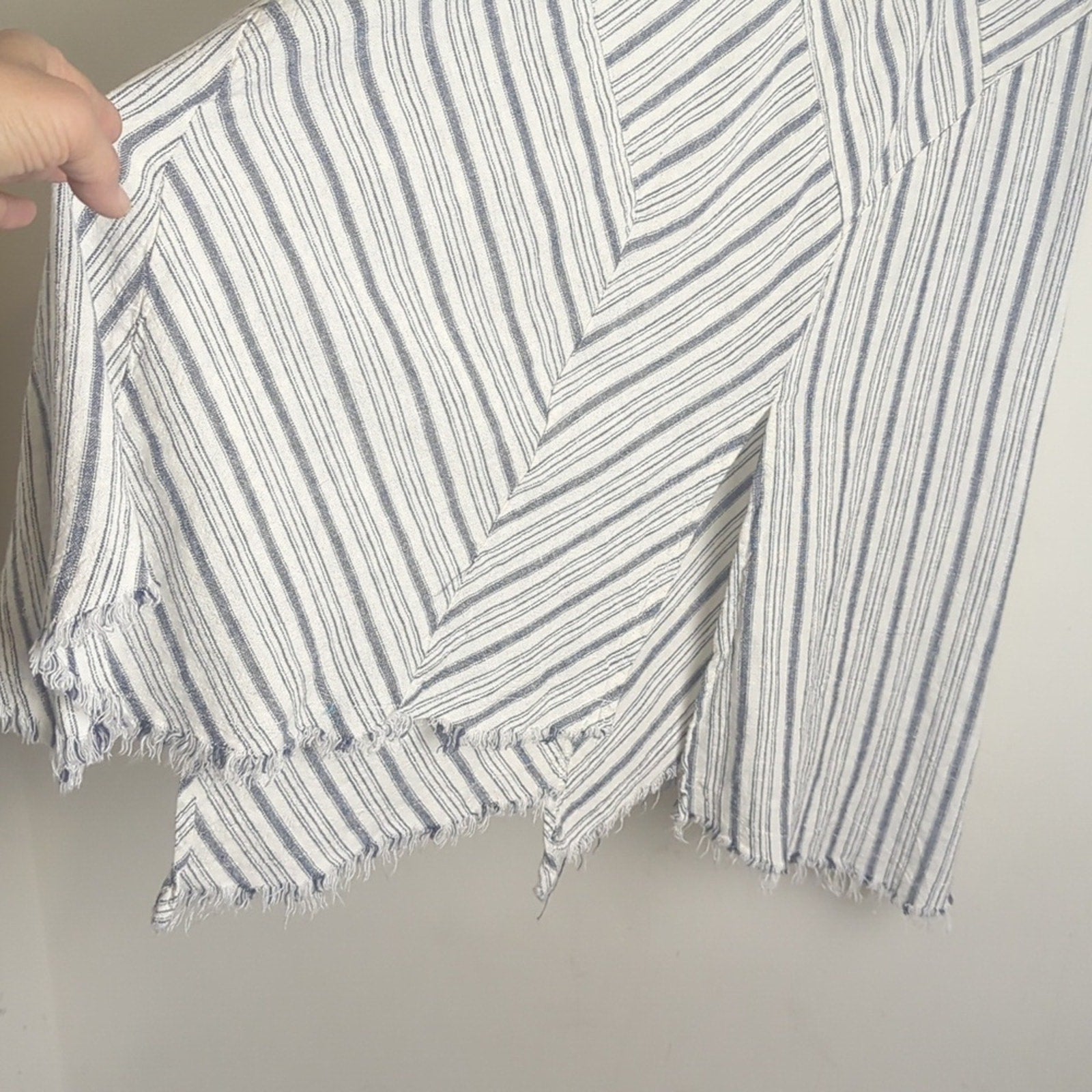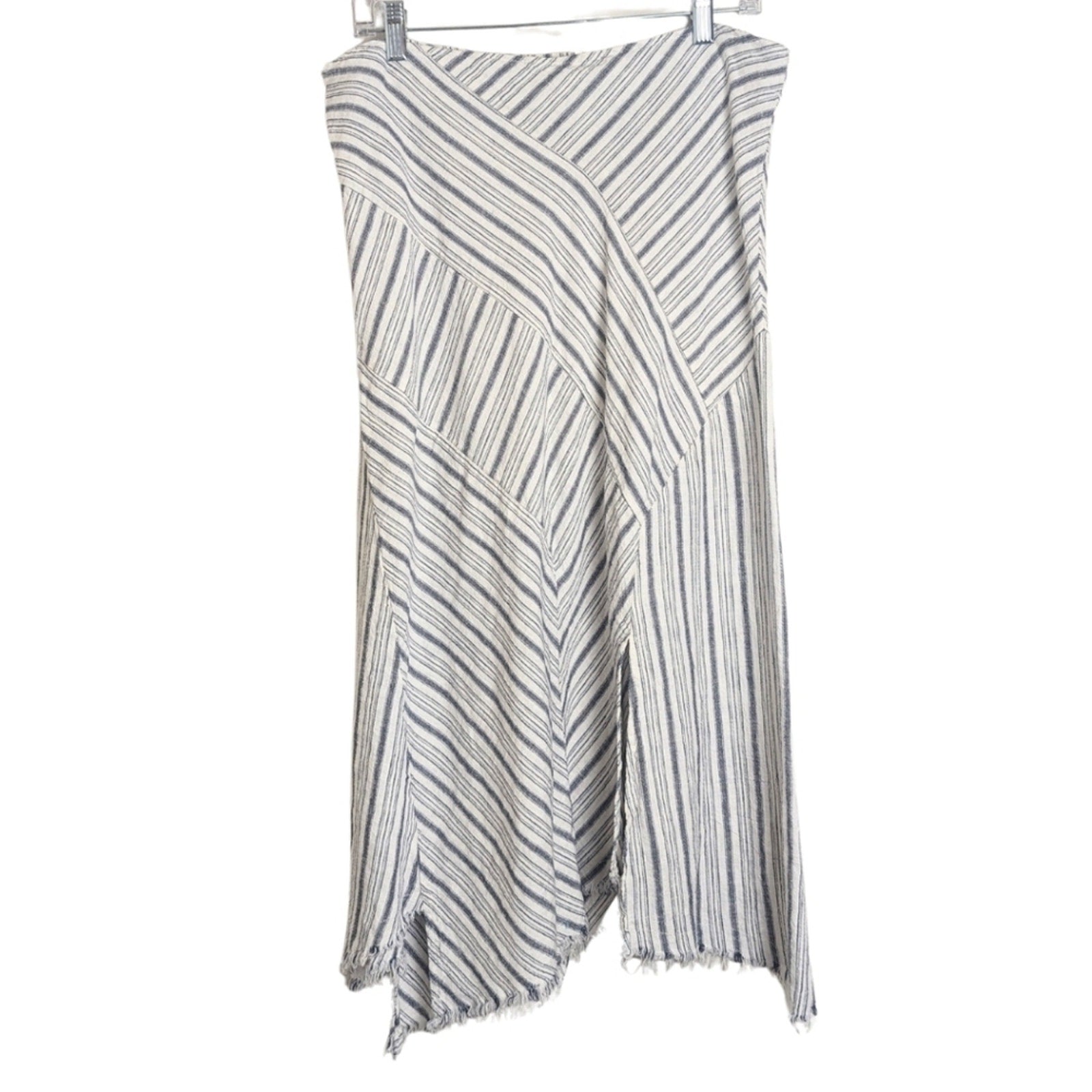 Great condition ,lightweight semi sheer linen and viscose asymmetrical striped skirt with handkerchief raw hemline. No pockets but perfect to pair with a crossbody bag!