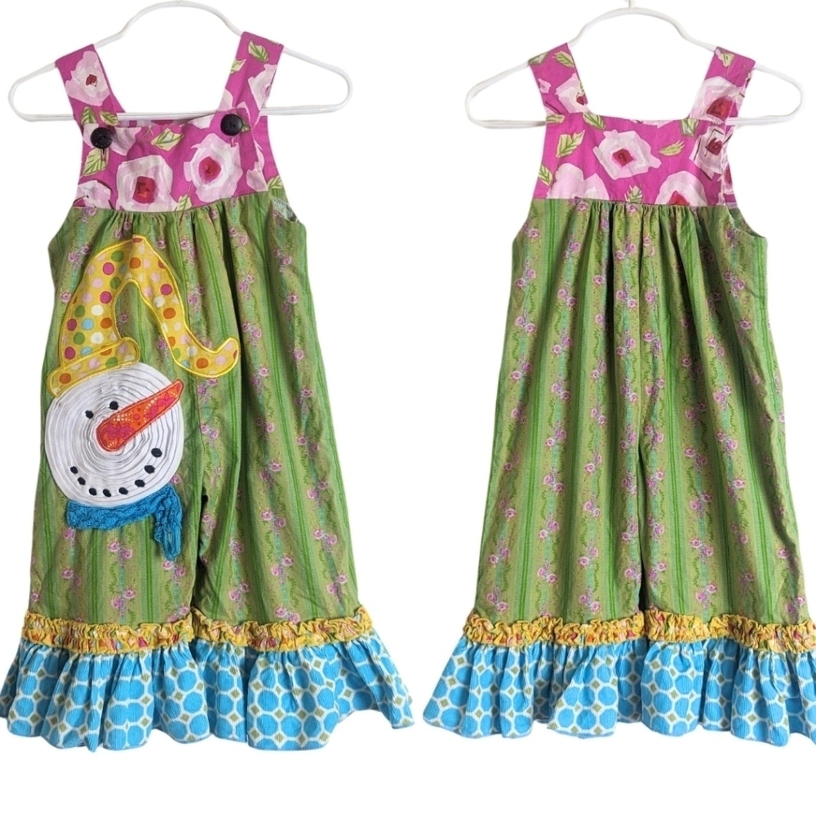 Adorable romper with mixed media of Corduroy bell bottoms polka. ruffle trim with floral print and textured Patchwork snowman!