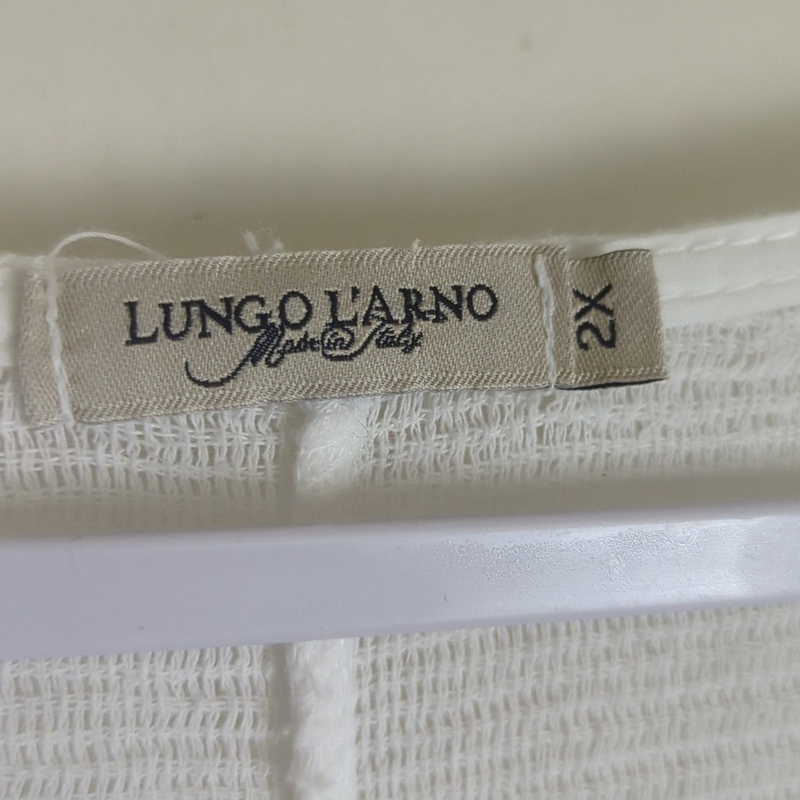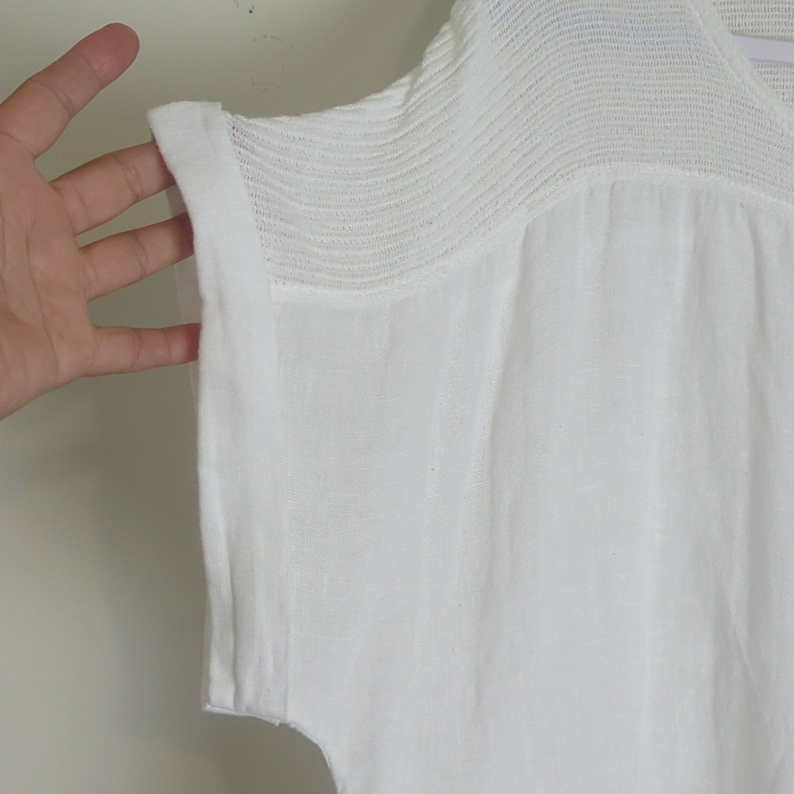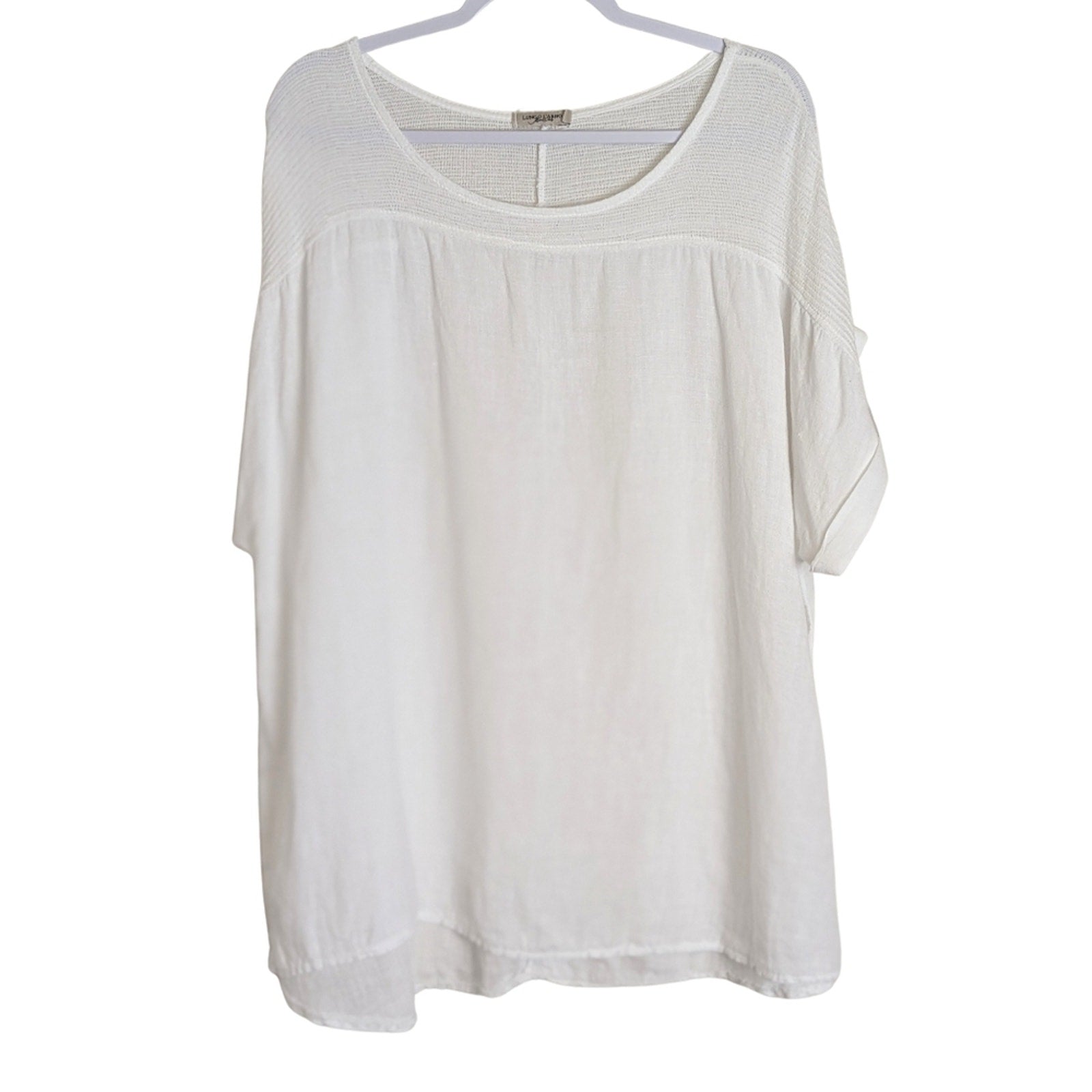 100% linen made in Italy. Cotton crochet shoulder to short sleeve arms, woven linen bodice.