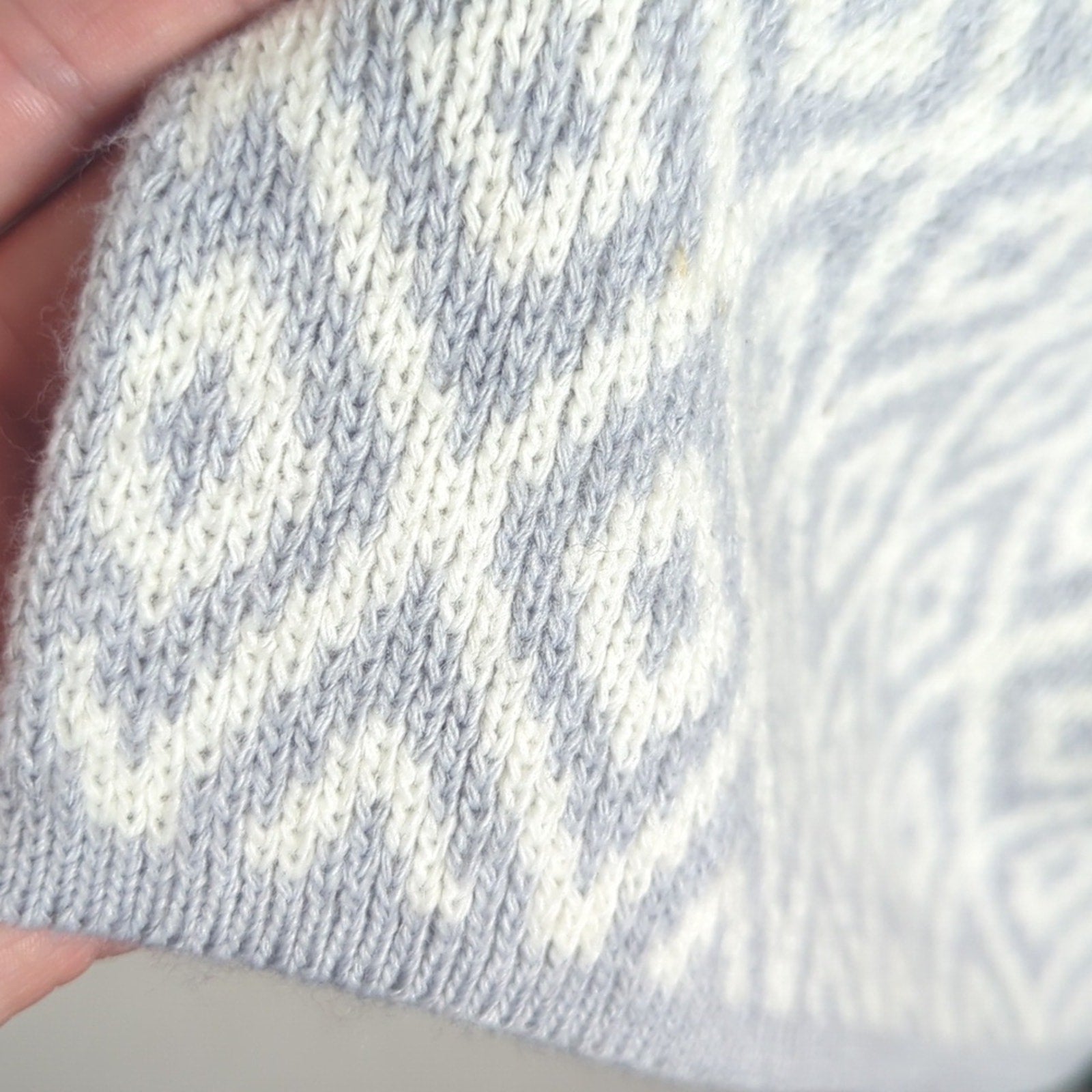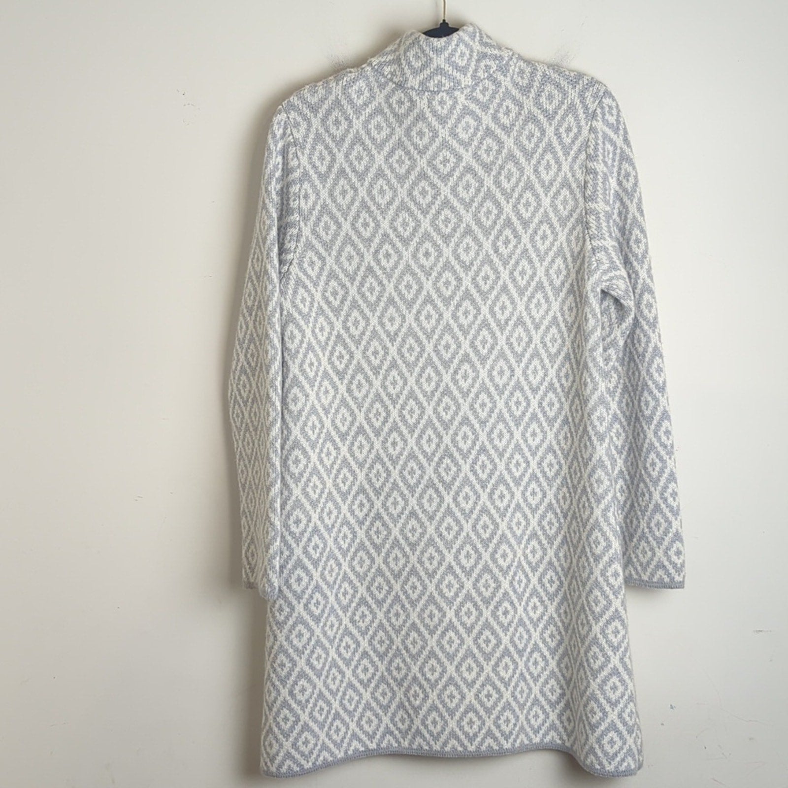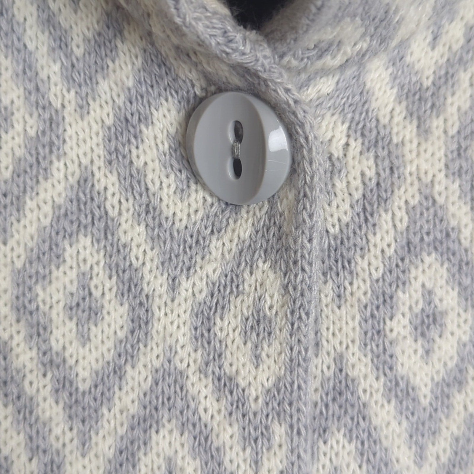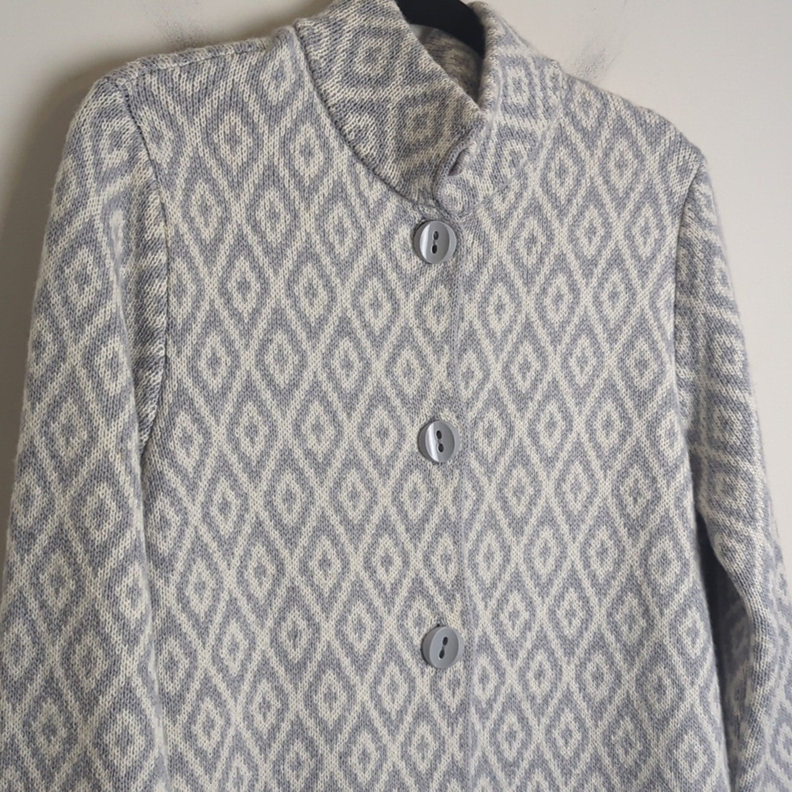 Beautiful tight-knit heavy sweater coat/cardigan with side pockets and high neck. Light blue grey diamond design