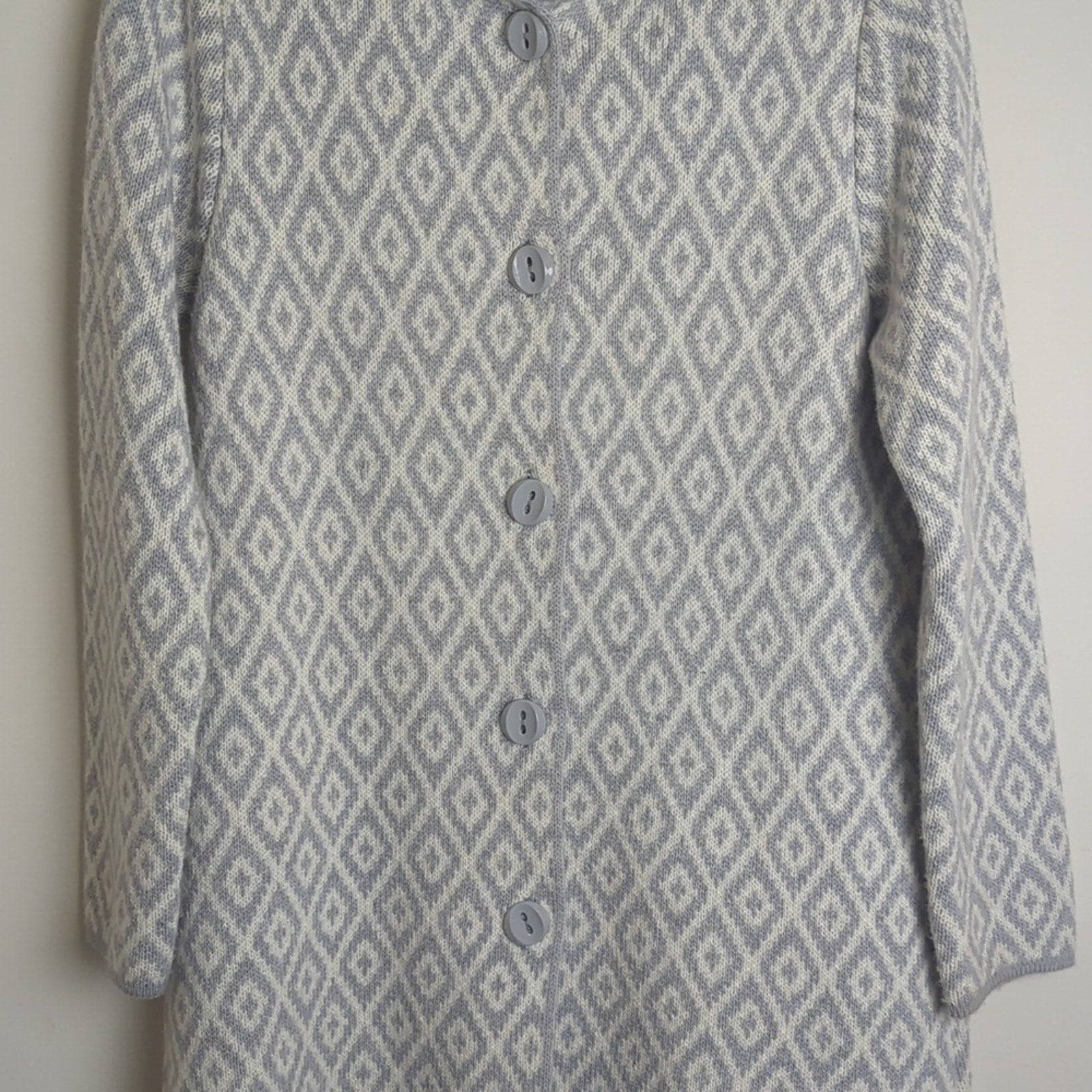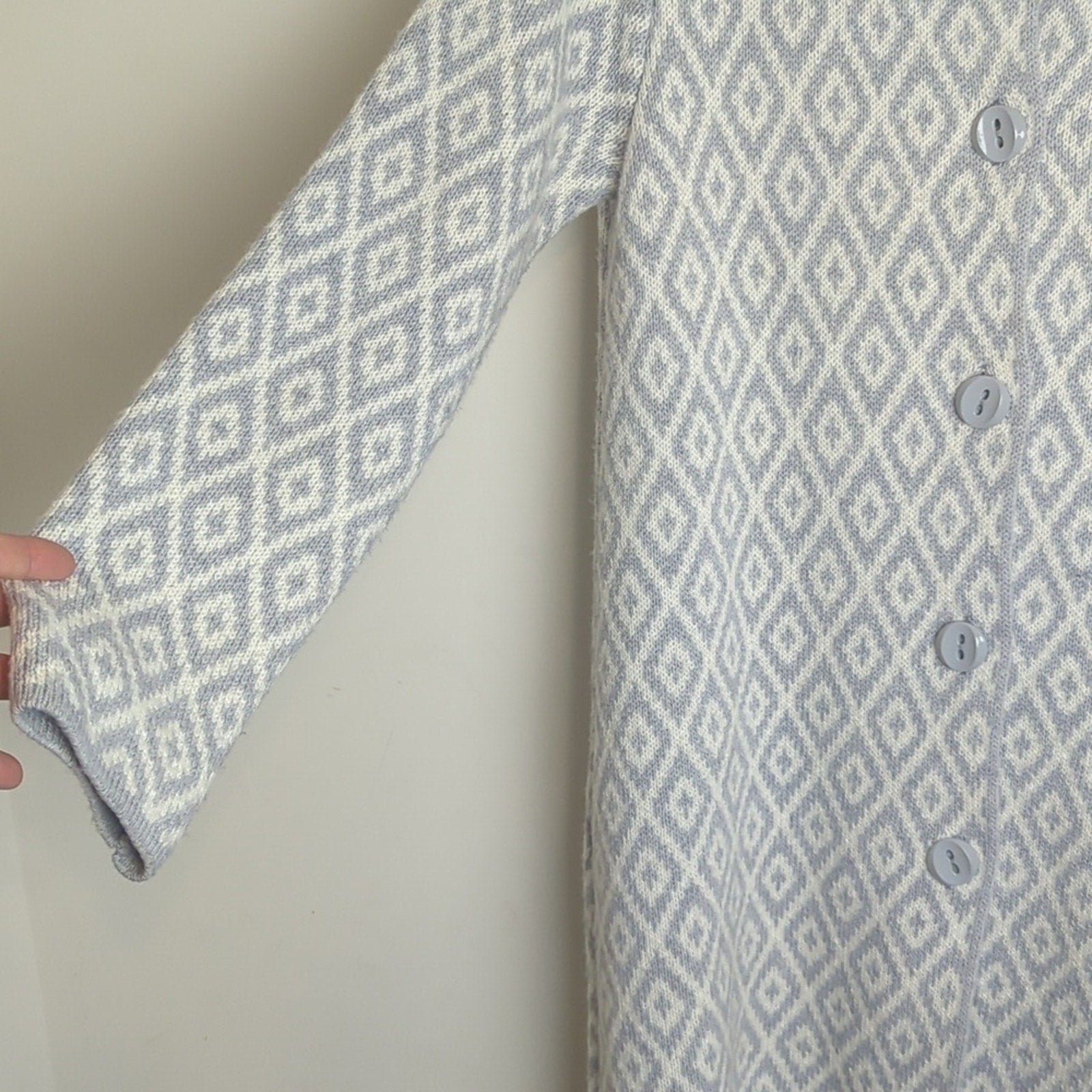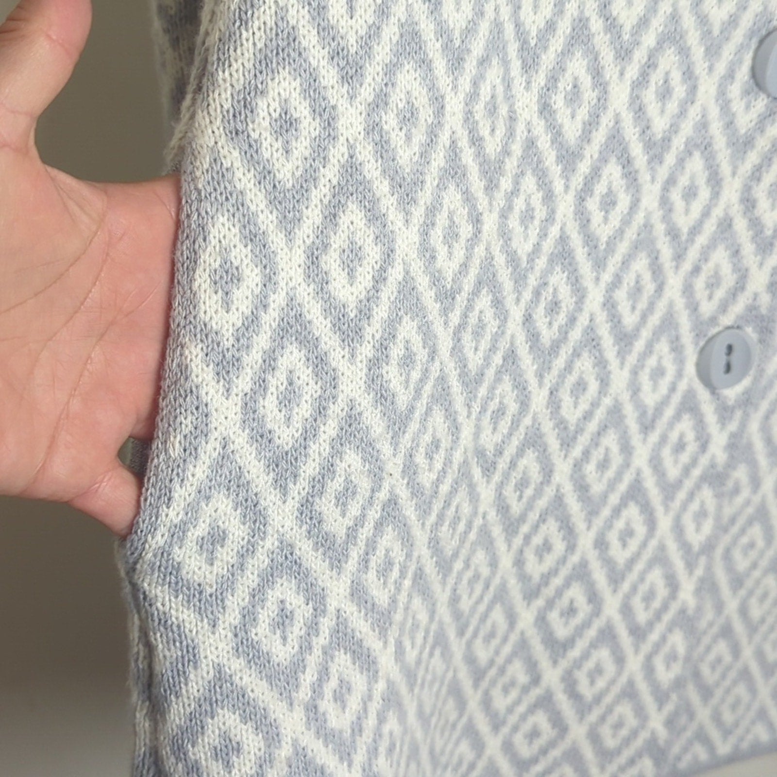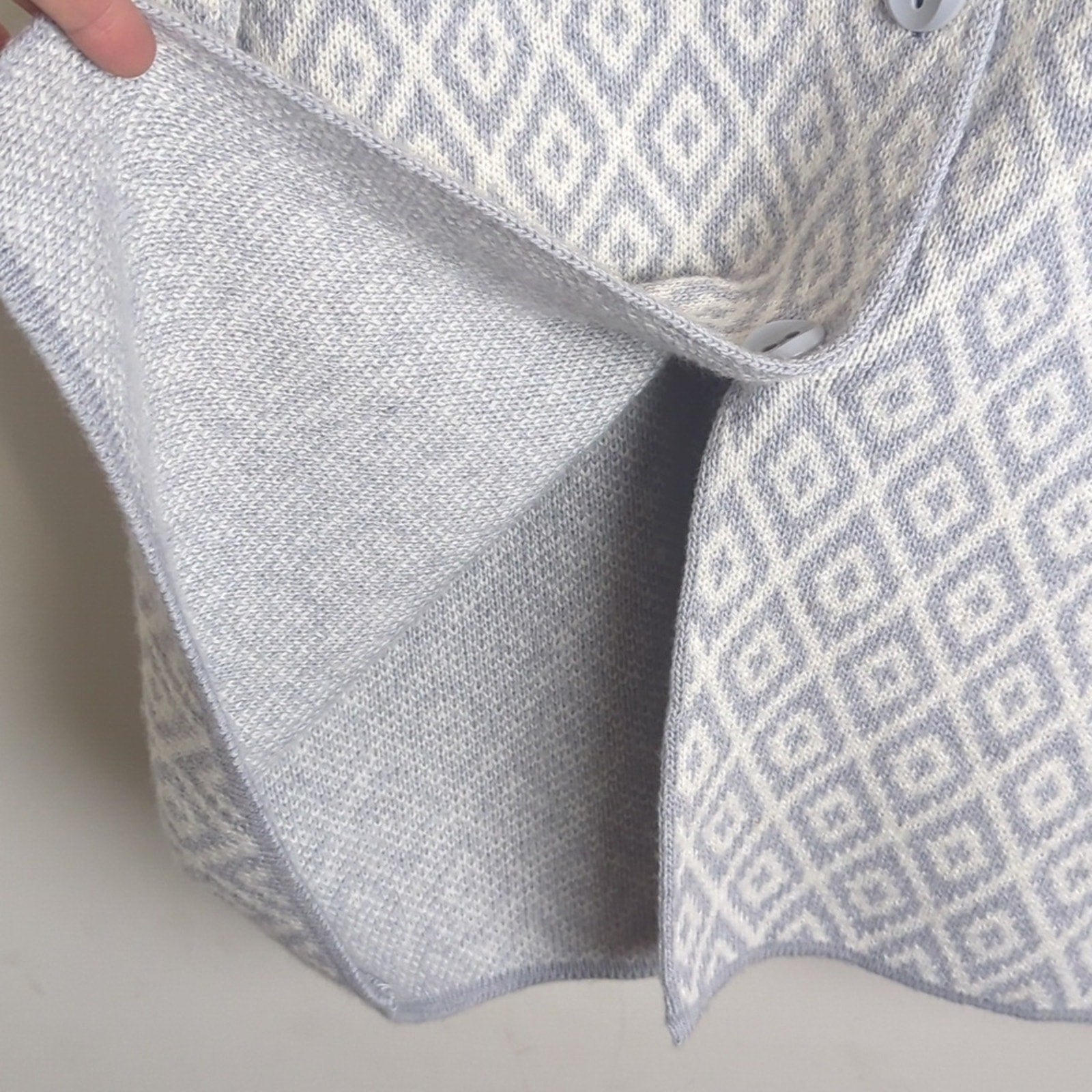 Beautiful tight-knit heavy sweater coat/cardigan with side pockets and high neck. Light blue grey diamond design