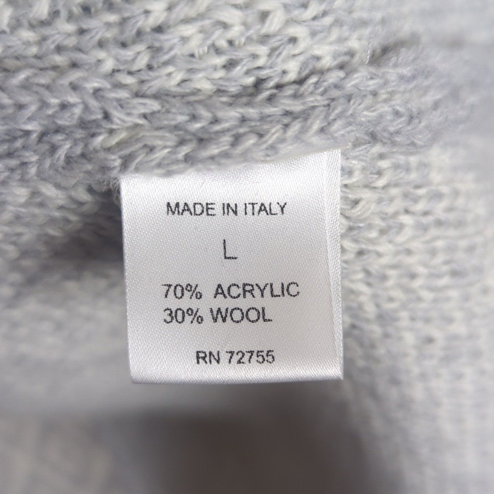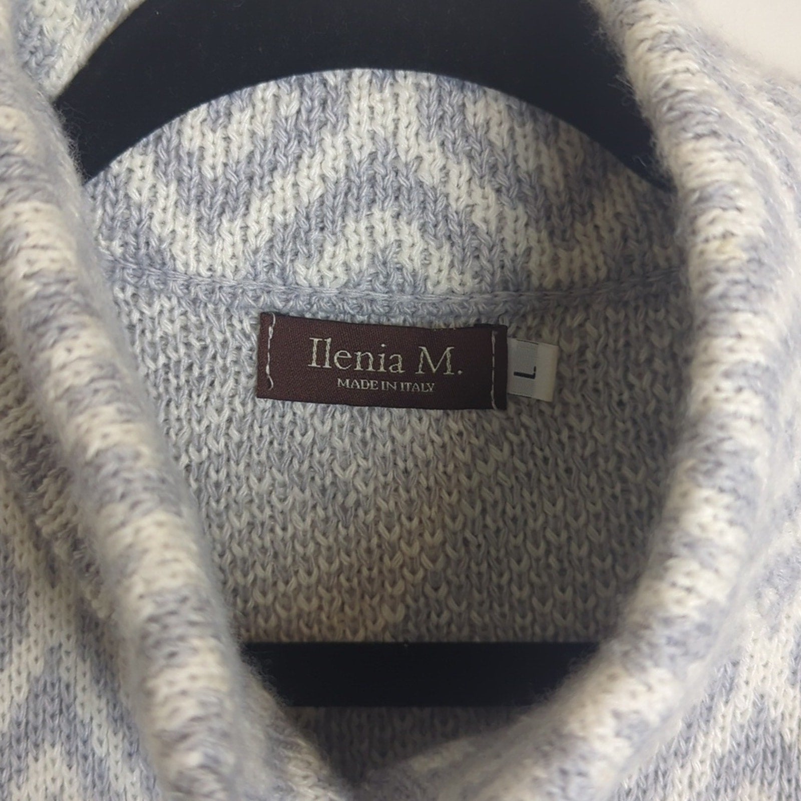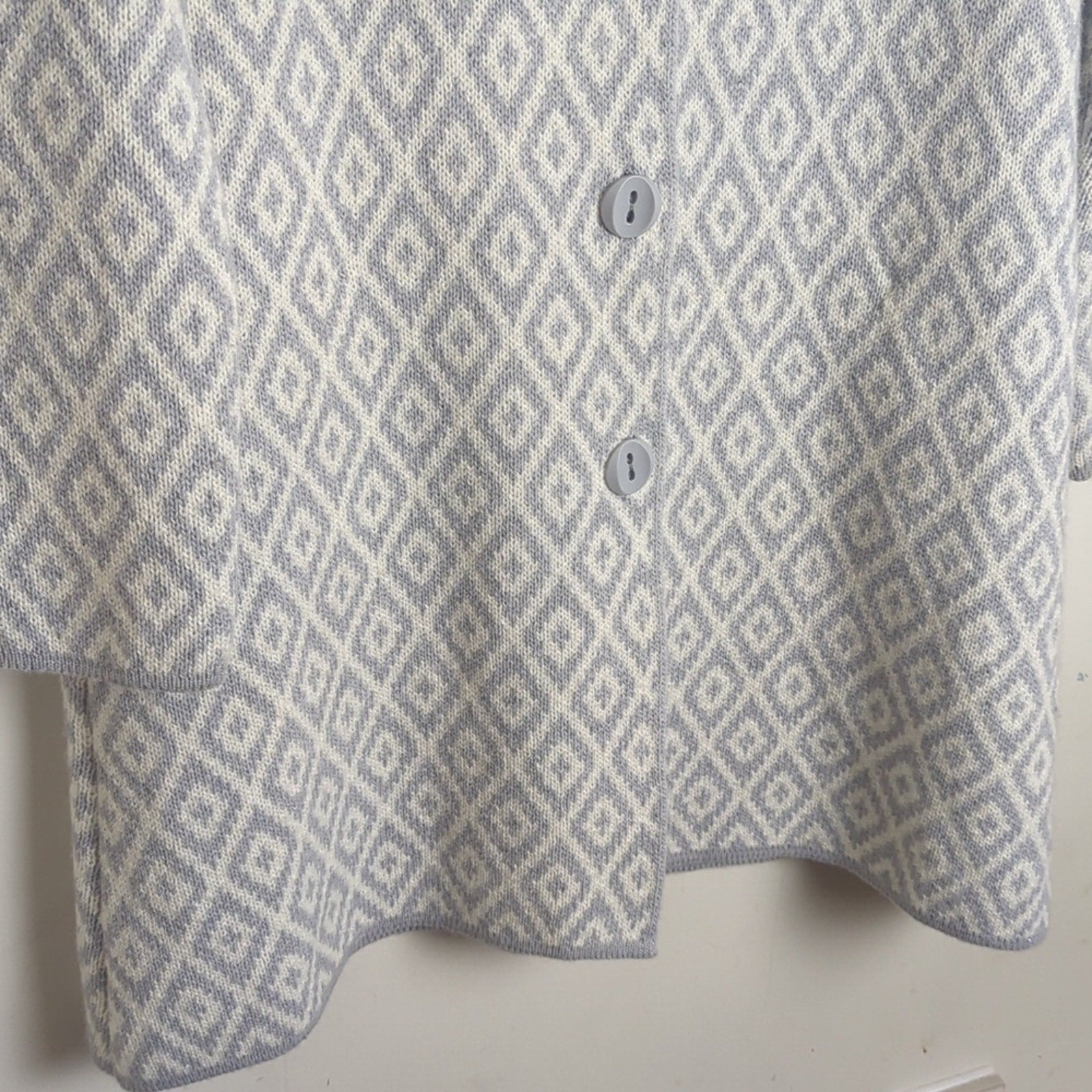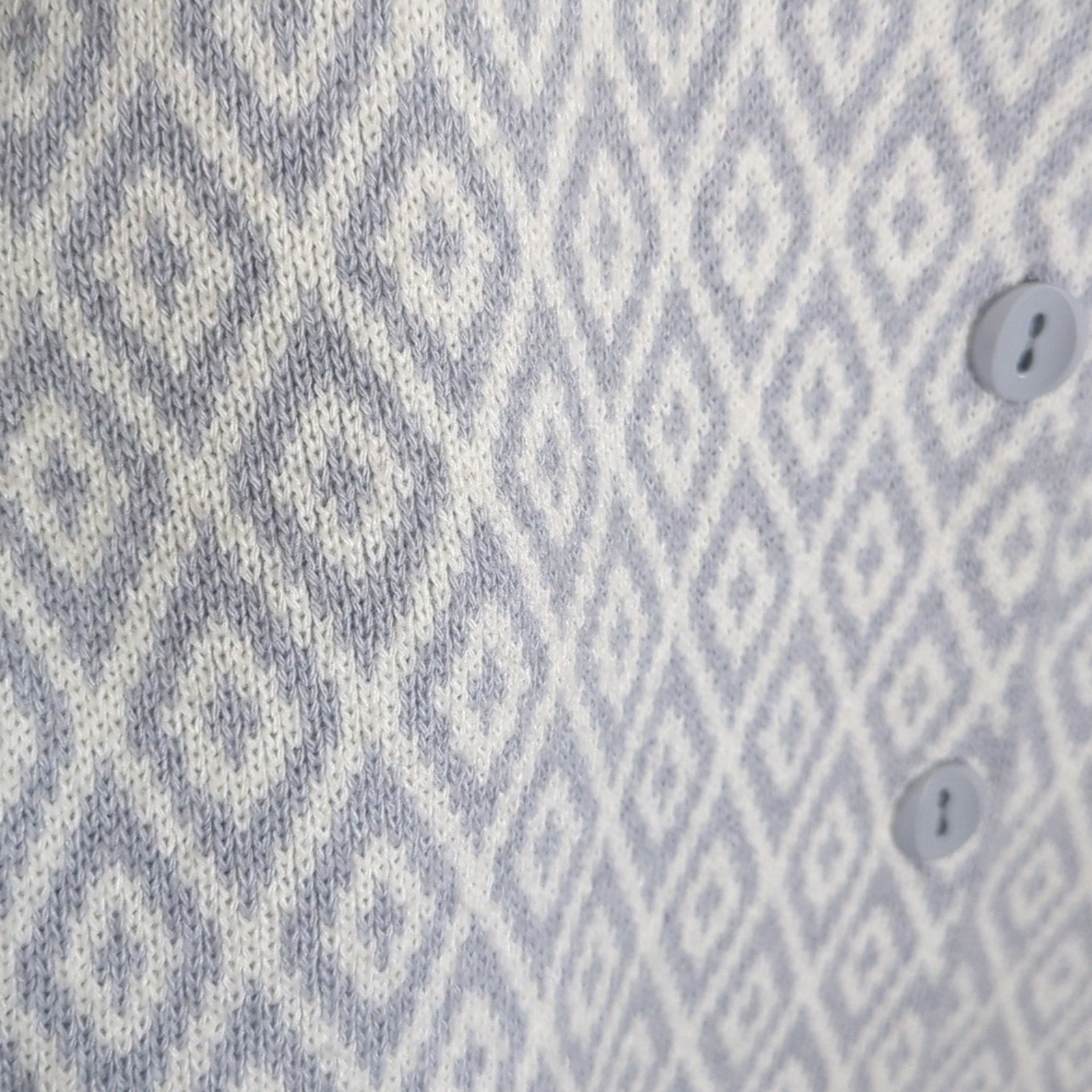 Beautiful tight-knit heavy sweater coat/cardigan with side pockets and high neck. Light blue grey diamond design