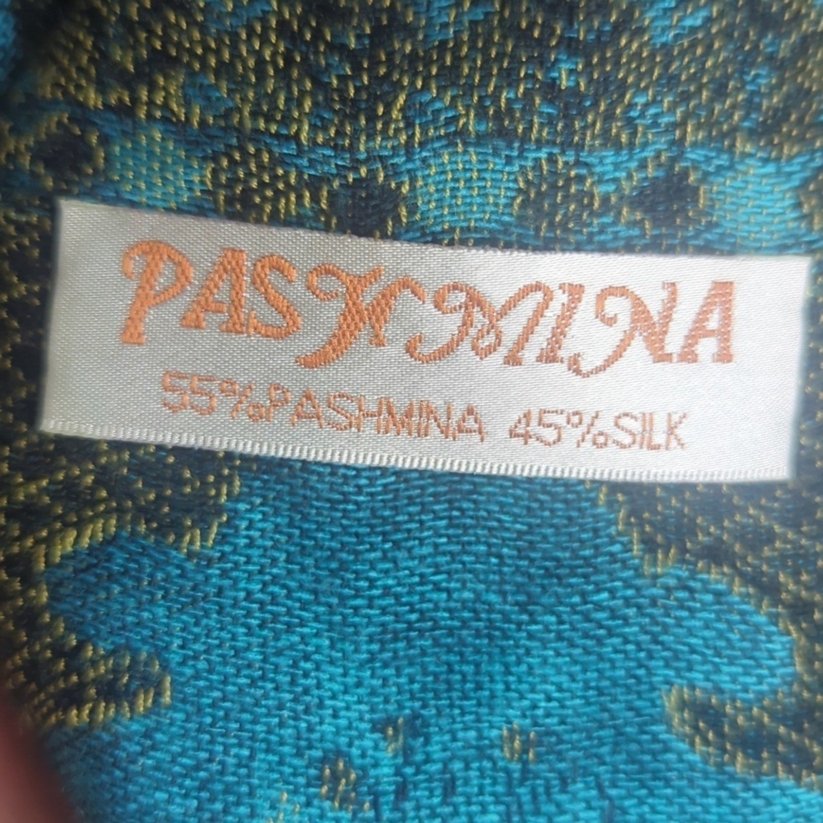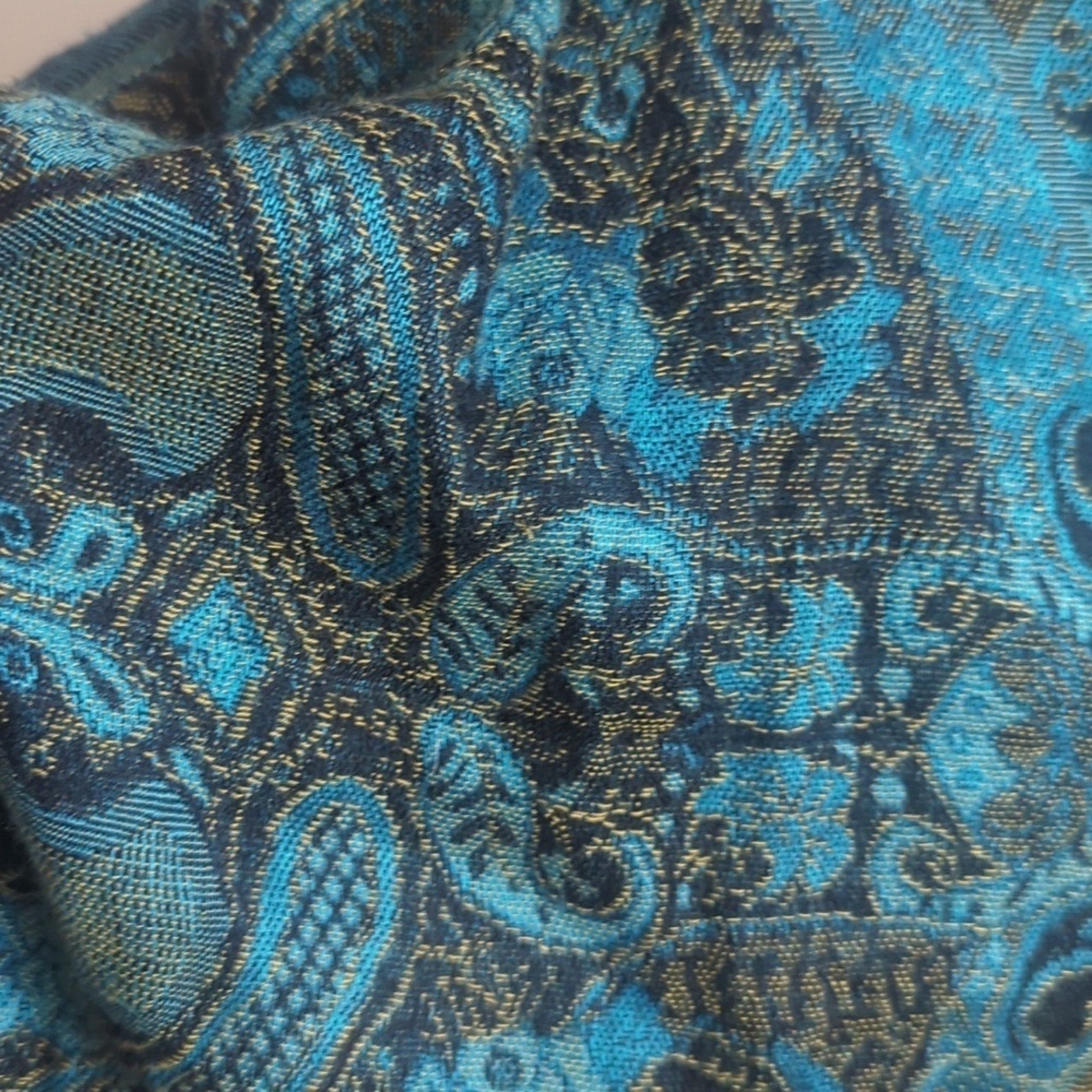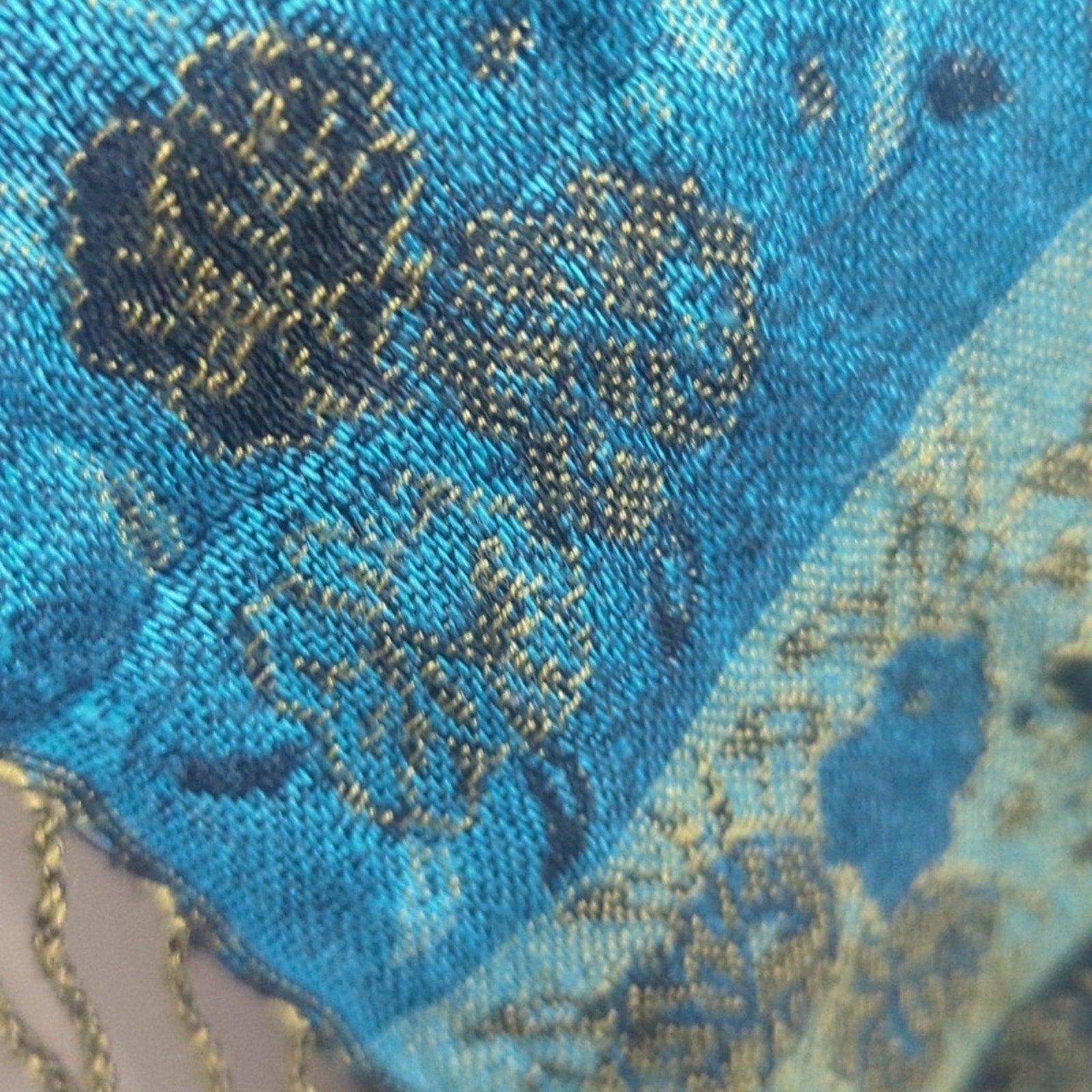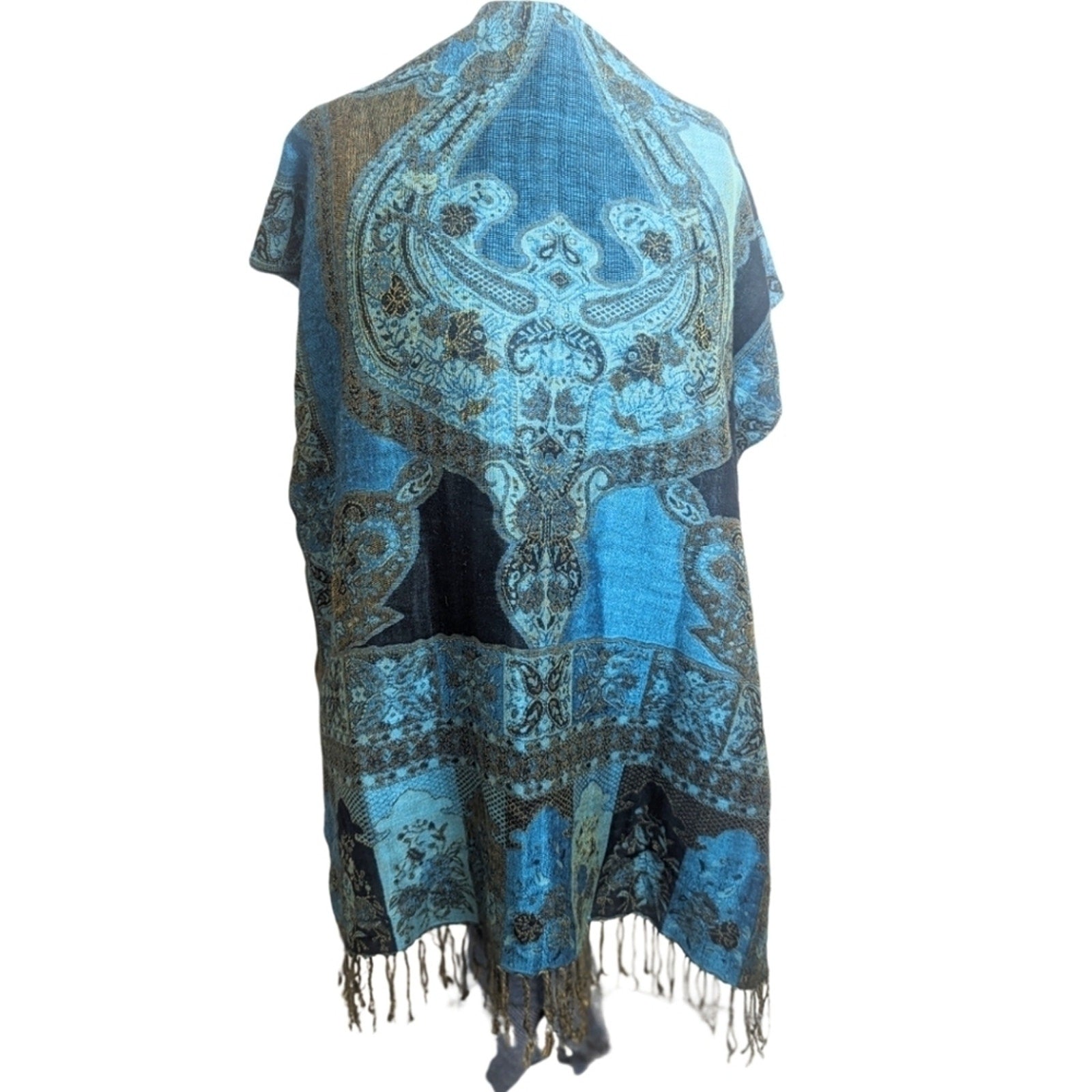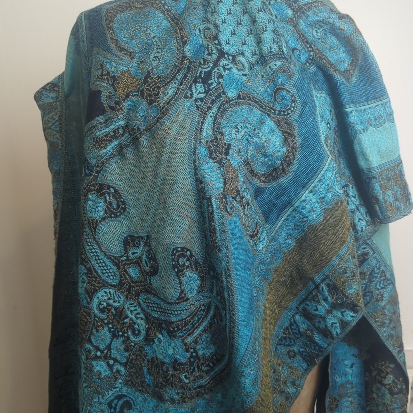 Beautiful extra wide turquoise and gold scarf made of cashmere and silk with fringe detail on the end.