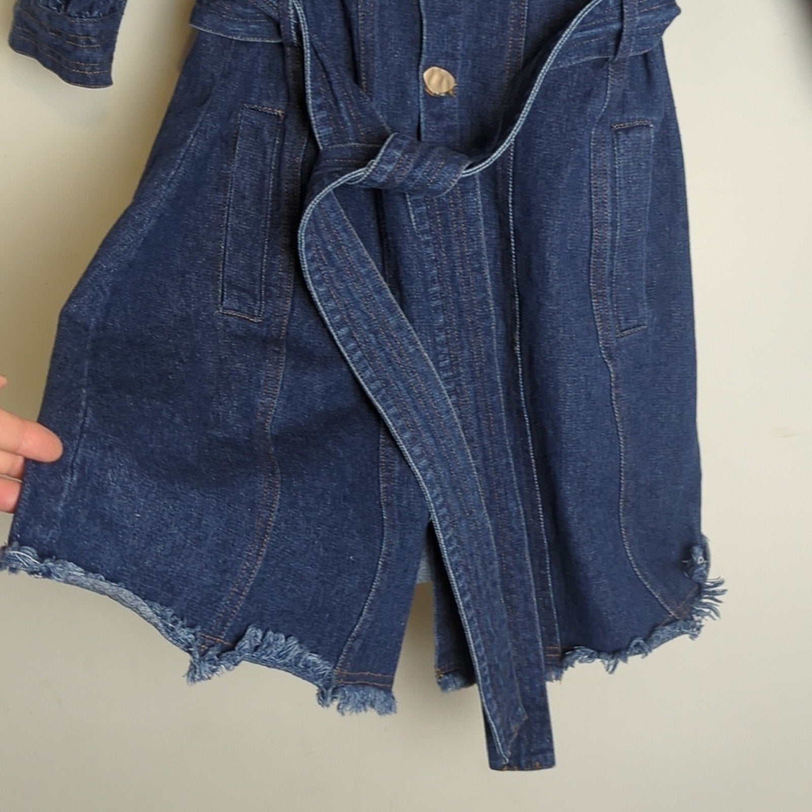 NWOT long trench jean jacket with matching belt, pockets and 3/4 puff sleeves. Fringe Hemline. Contrasting gold color abstract buttons.