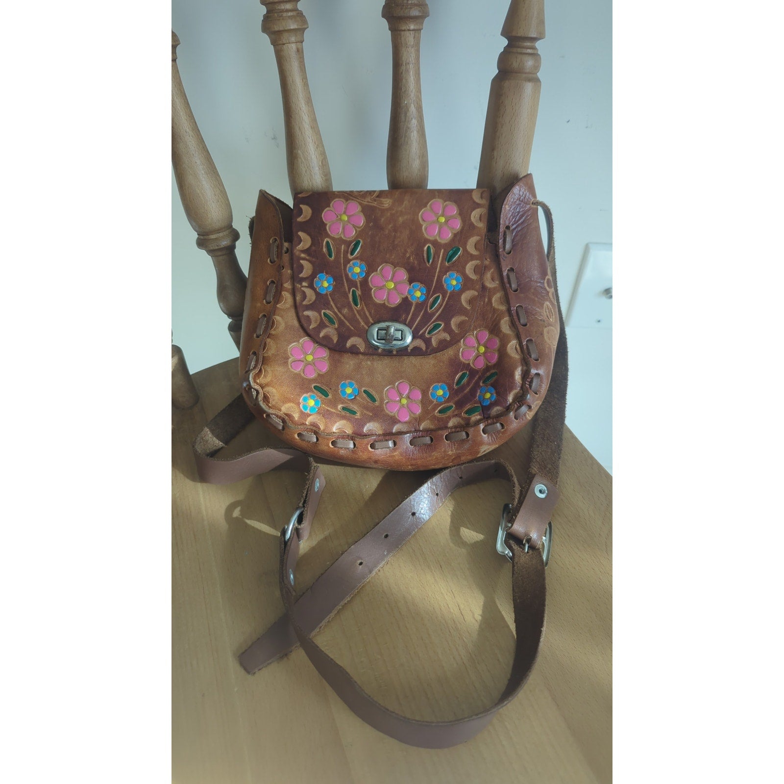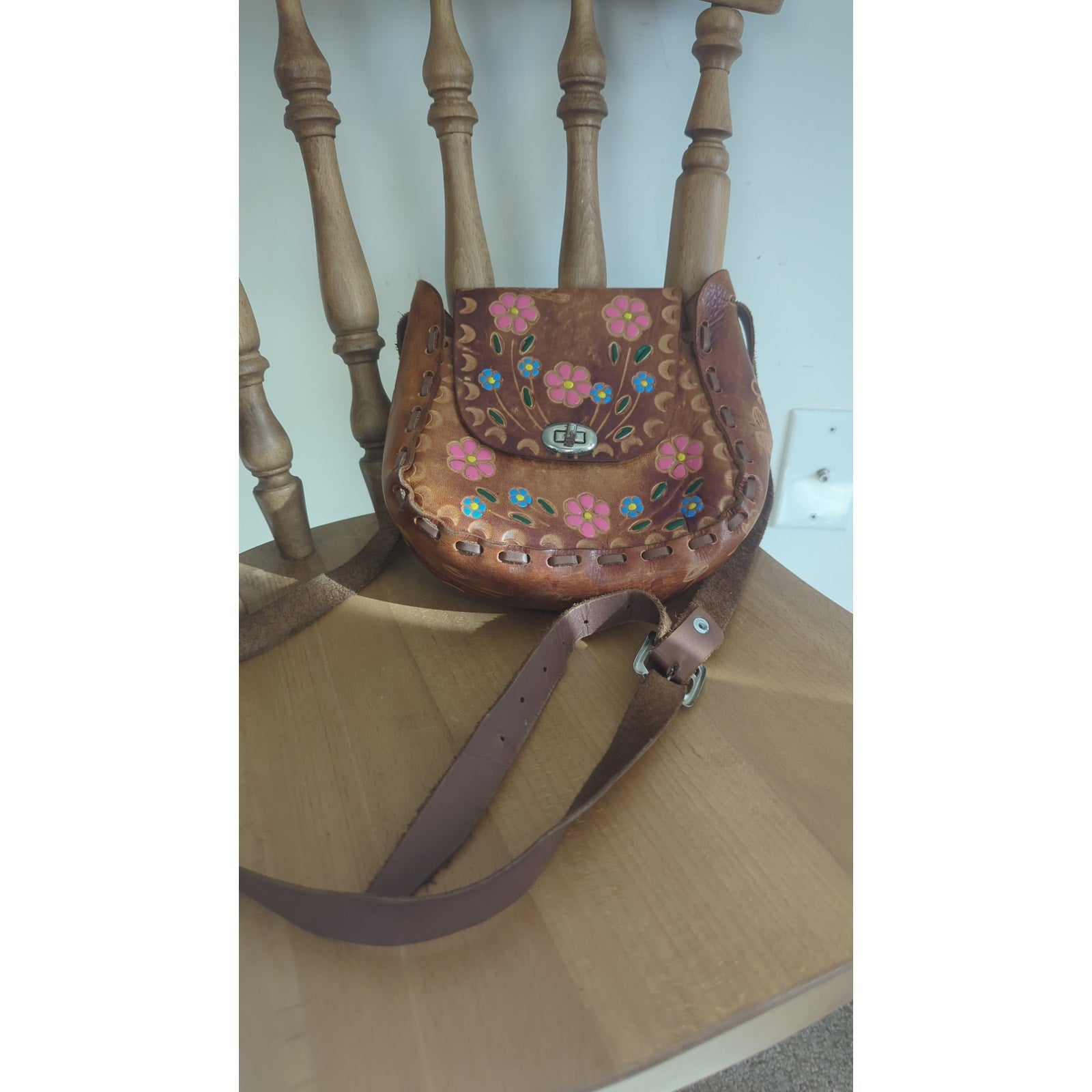 Authentic vintage leather crossbody purse made in Mexico. Features hand-tooled floral designs with painted pink and blue flowers, whip-stitched edges, and an adjustable leather strap. Beautiful boho folk style with natural patina from age and use. Perfect everyday bag or festival purse with true vintage character.