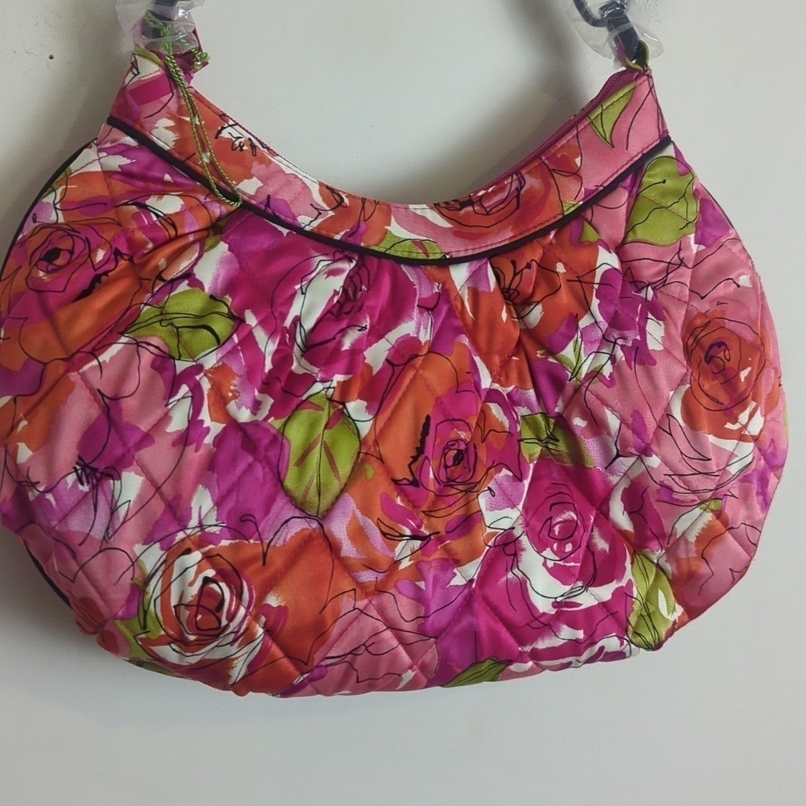 Pretty quilted pink floral pattern, Mane zipper opening one open pocket one zipper pocket inside.