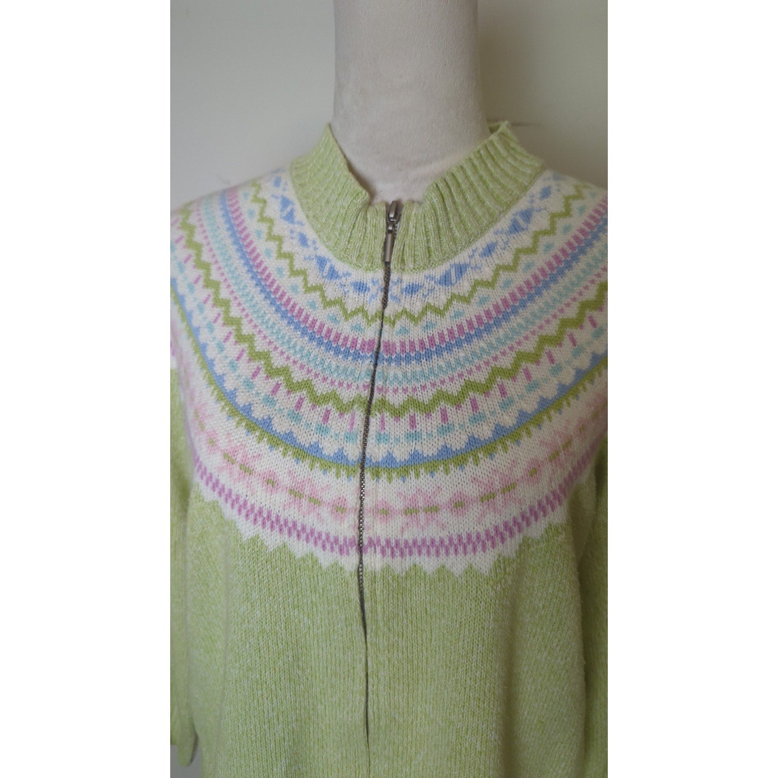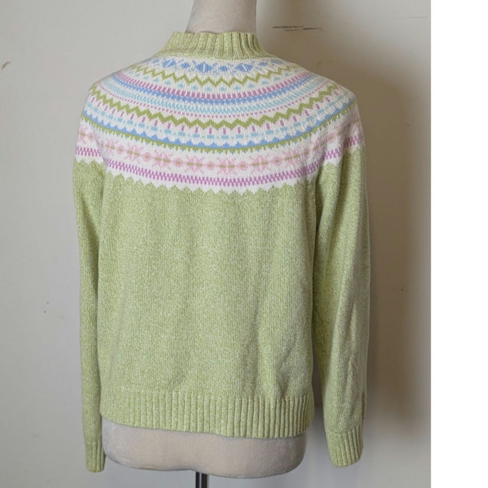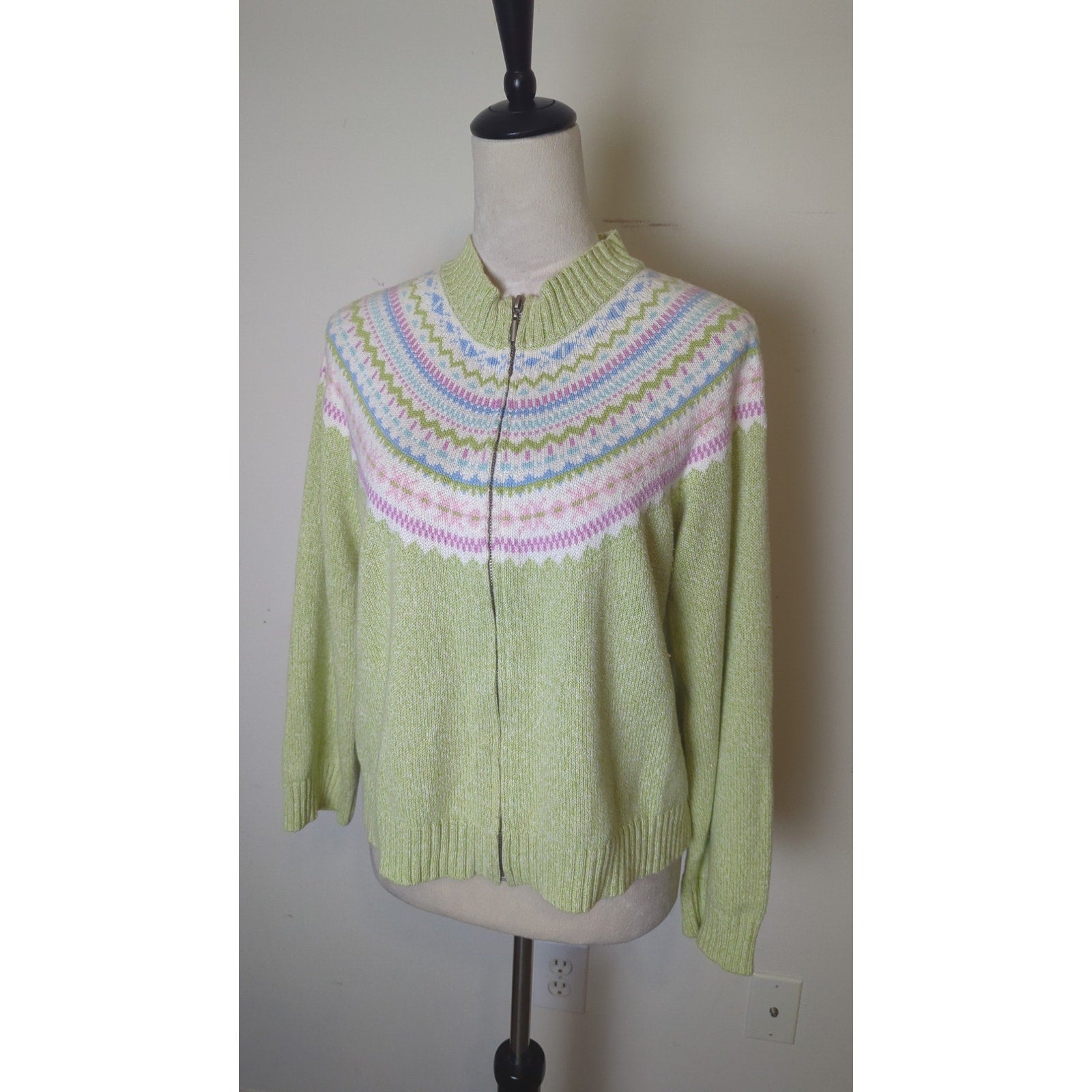 Amazing condition! 100% cotton zipper front Spring Green Fair Isle Cotton Cardigan Sweater Vintage , Pink, Blue and Light Green Fair Isle pattern