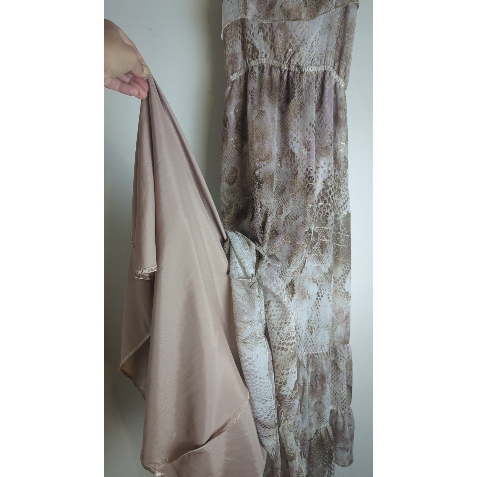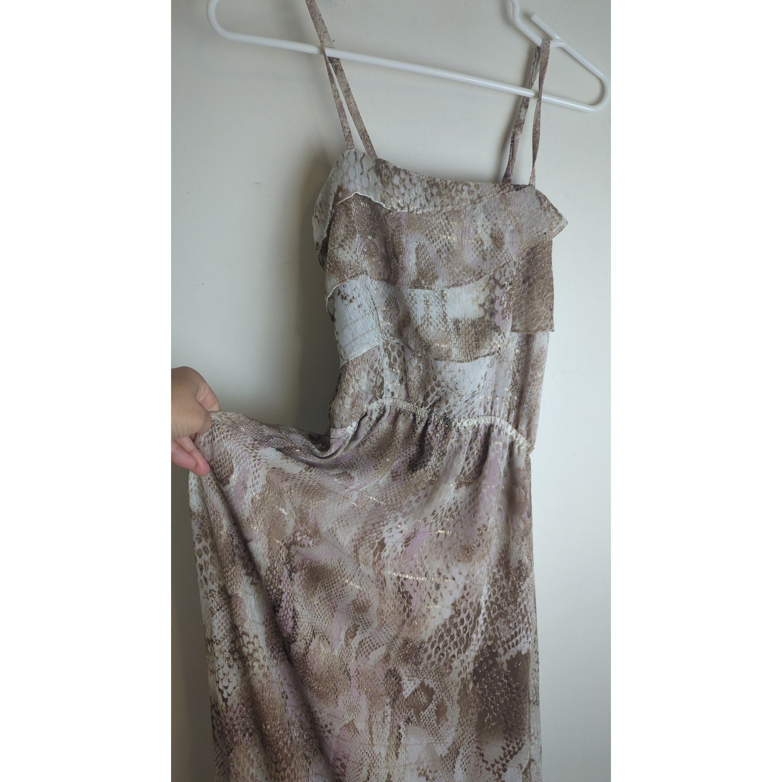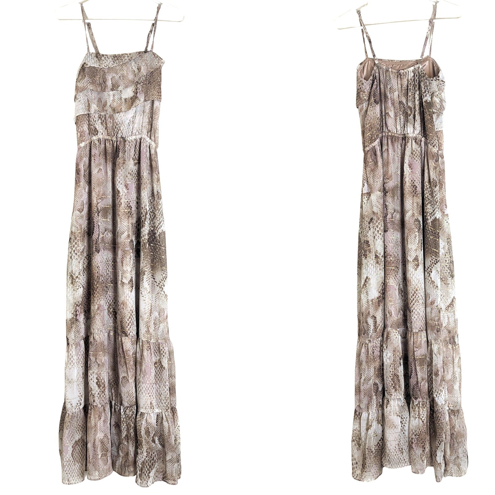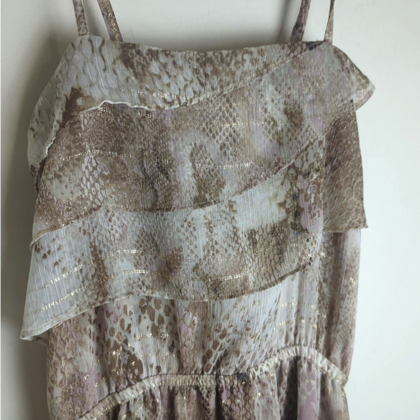 Like new condition! Ruffled tiered top, elastic waistband, ruffled hemline, Gold thread throughout on animal reptile print of pastel, pink , brown and white,
