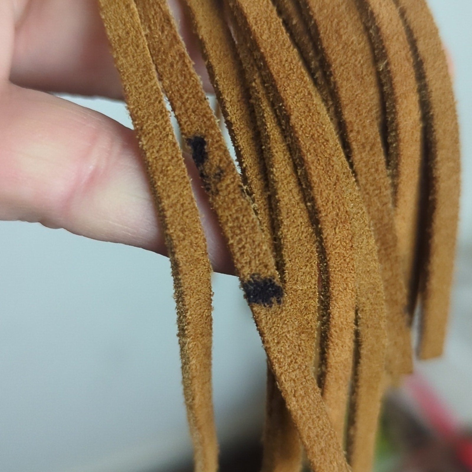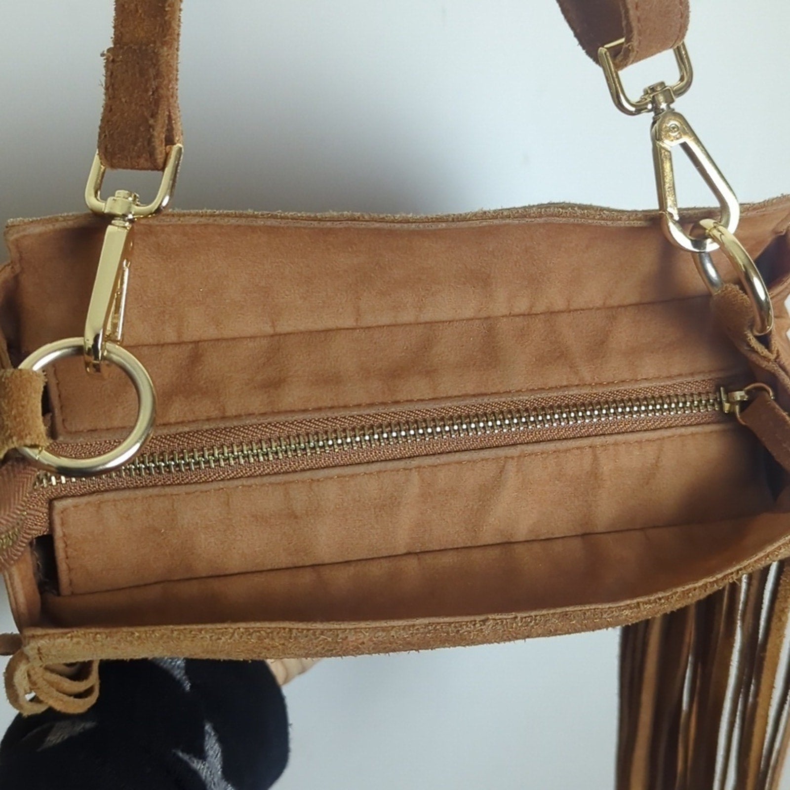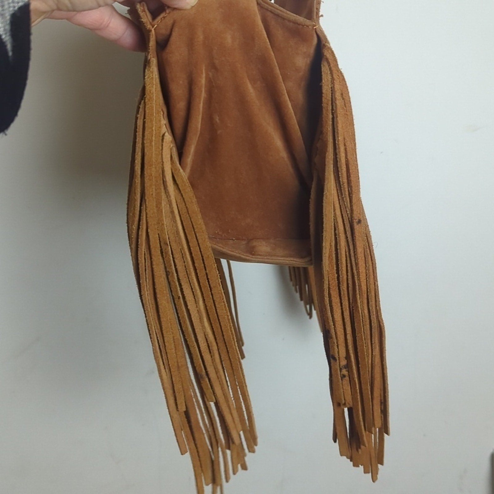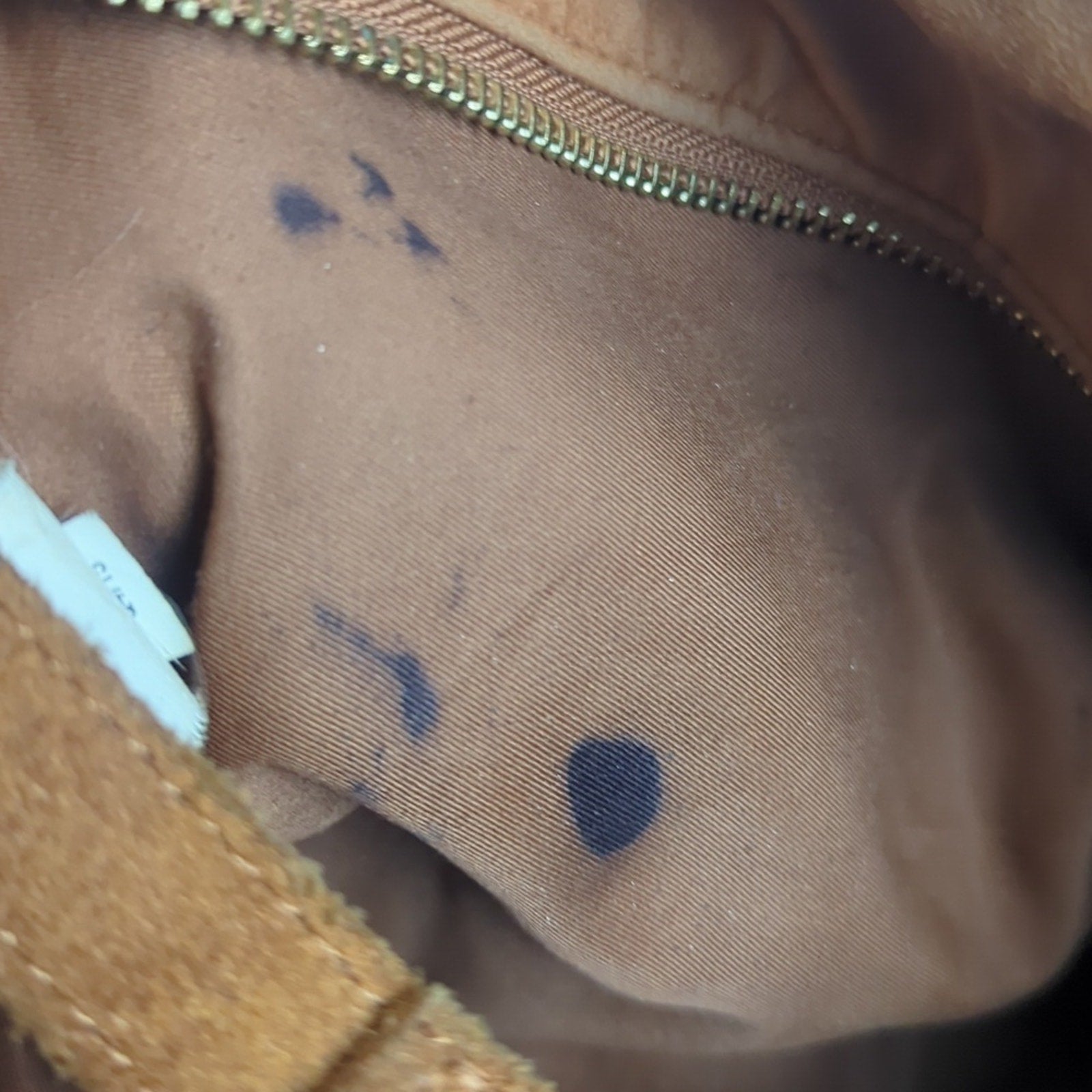 Love this! There are some ink stains on some of the tassels and on the inside. Some wear and discolorization to the suede panels on the front and back but no tears or holes!