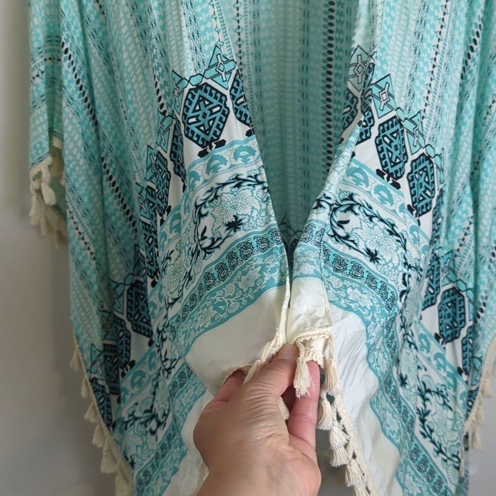 Great condition! Turquoise and cream poncho with tassels along Poncho sleeves and hemline! Handkerchief hemline