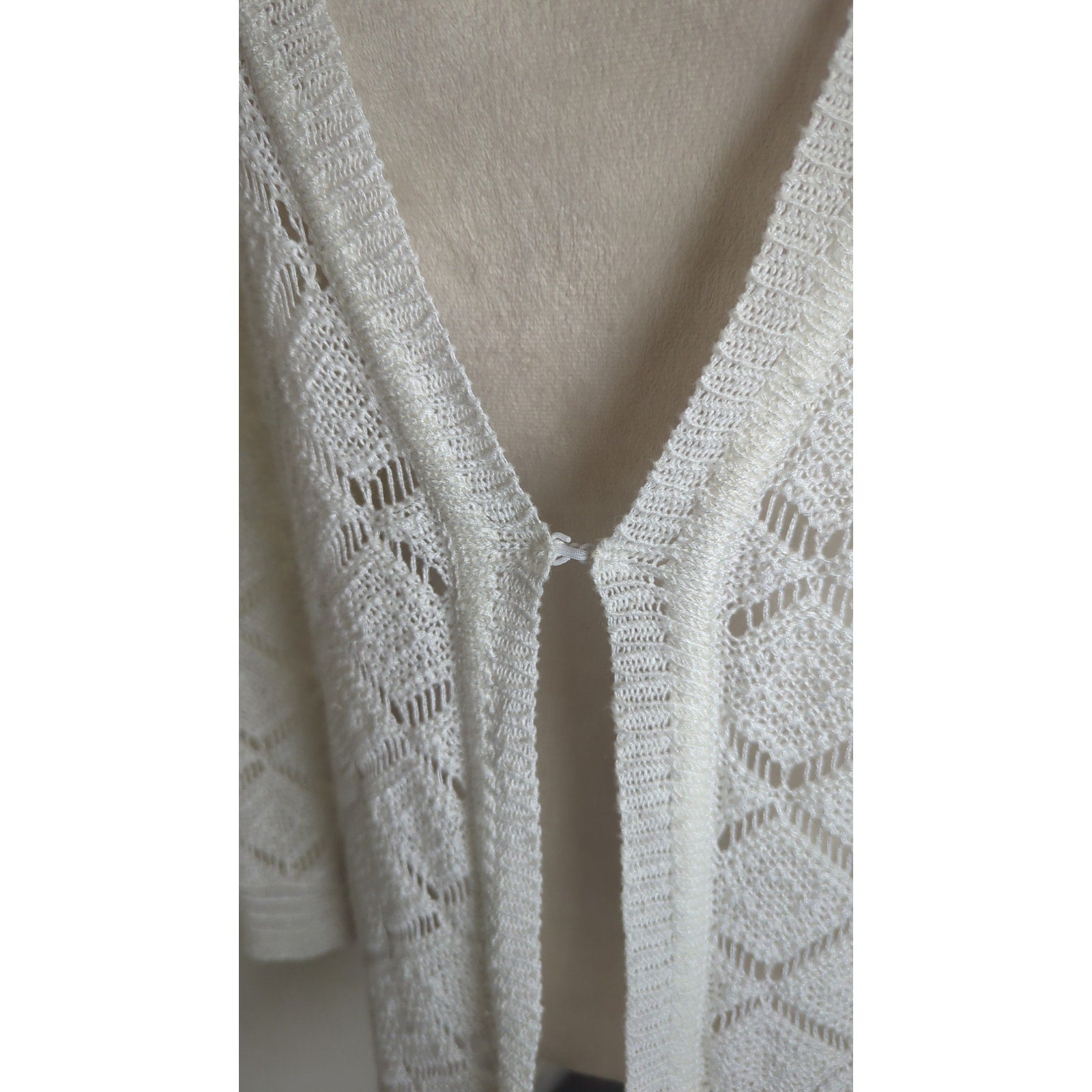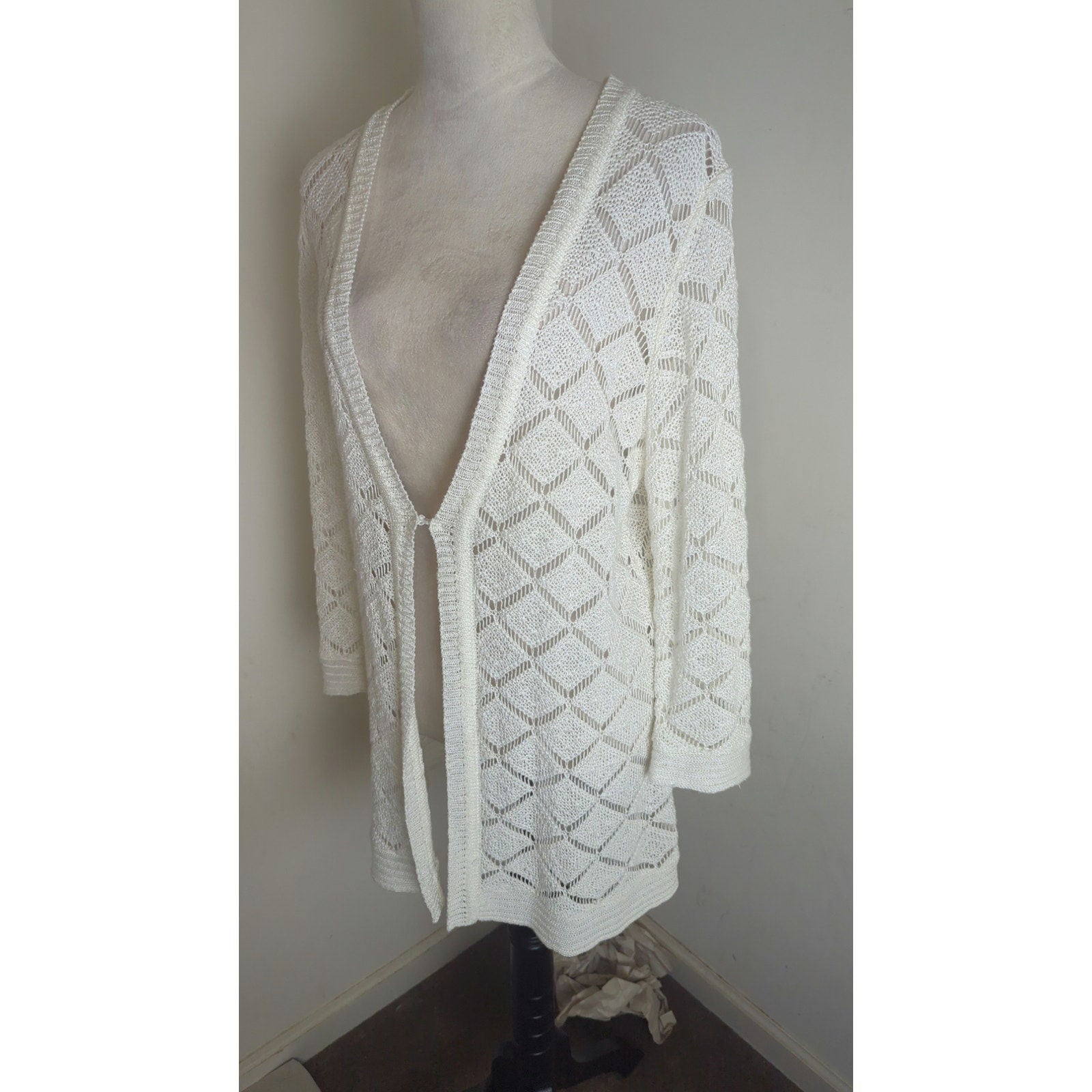 Beautiful linen rayon blend knit cardigan with hook clasp closure. Diamond shape open knit pattern. No holes or tears.