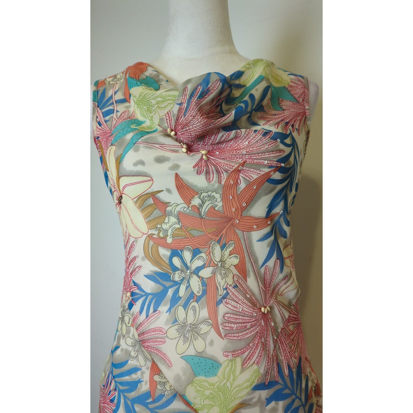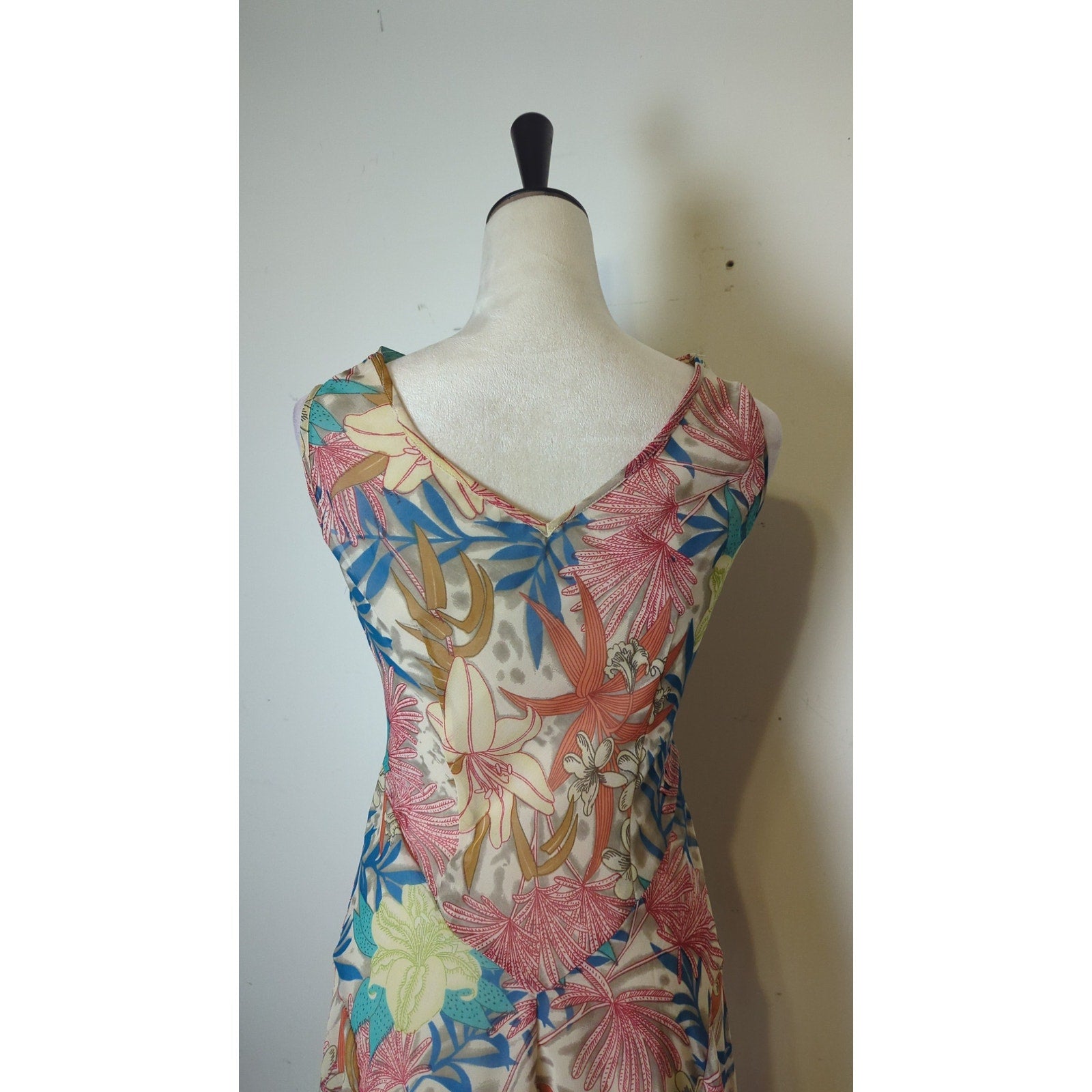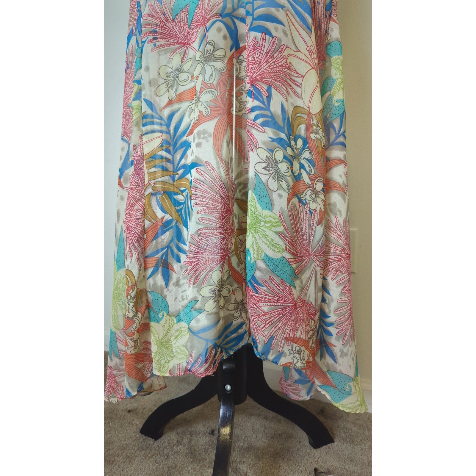 Beautiful! Sheer dress with flattering v-waistline,, swoop neckline with beading & sequence, tropical boho print, Whimsical fairycore hemline.