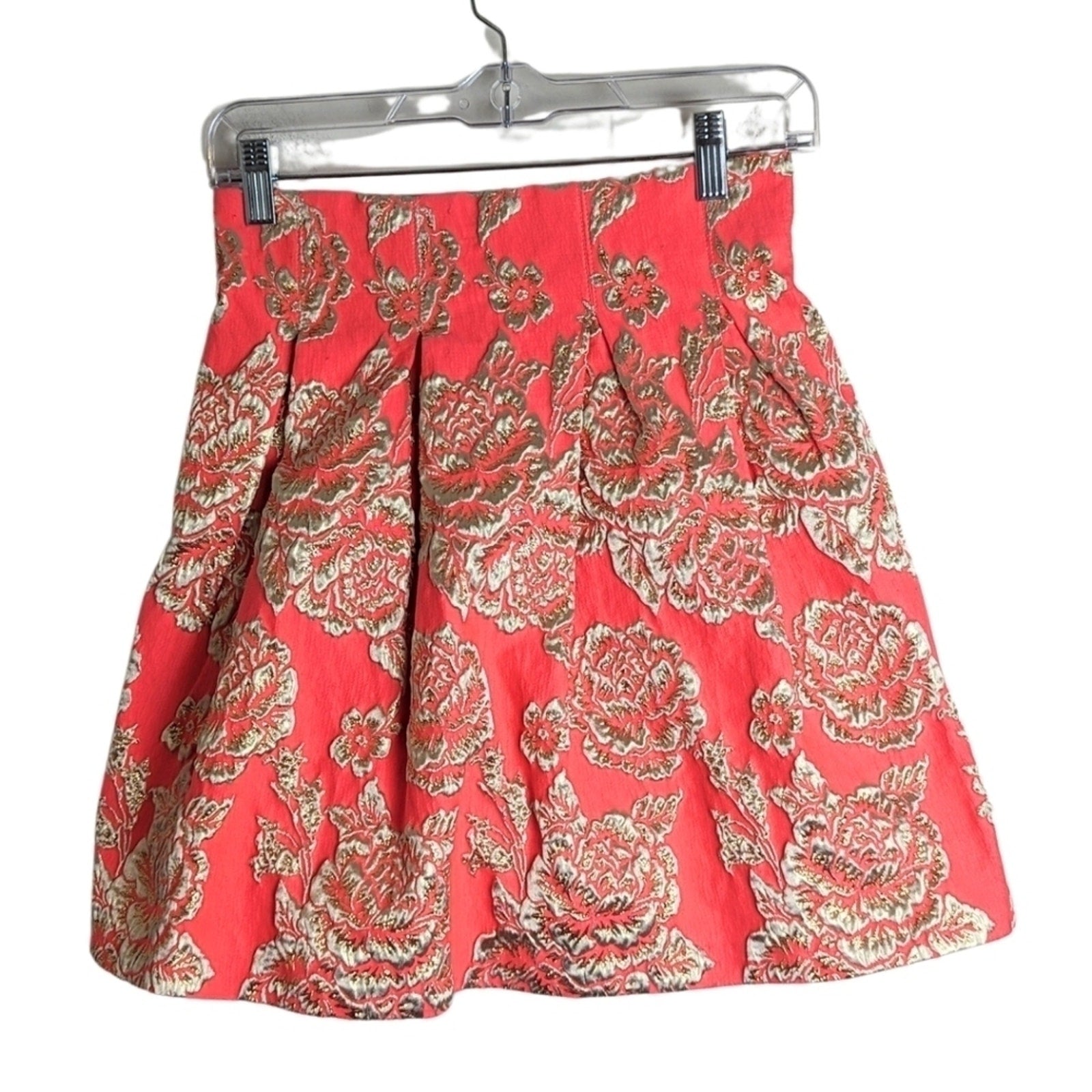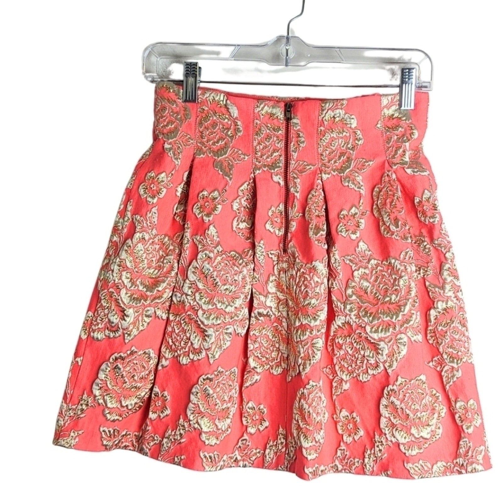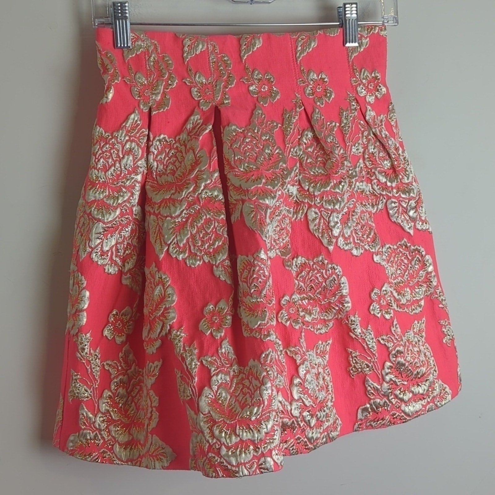New with Tags Bright pink Mini puff skirt with gold and silver elevated floral print. pleated, all the way around, below waistline and exposed zipper closure on back. Lined