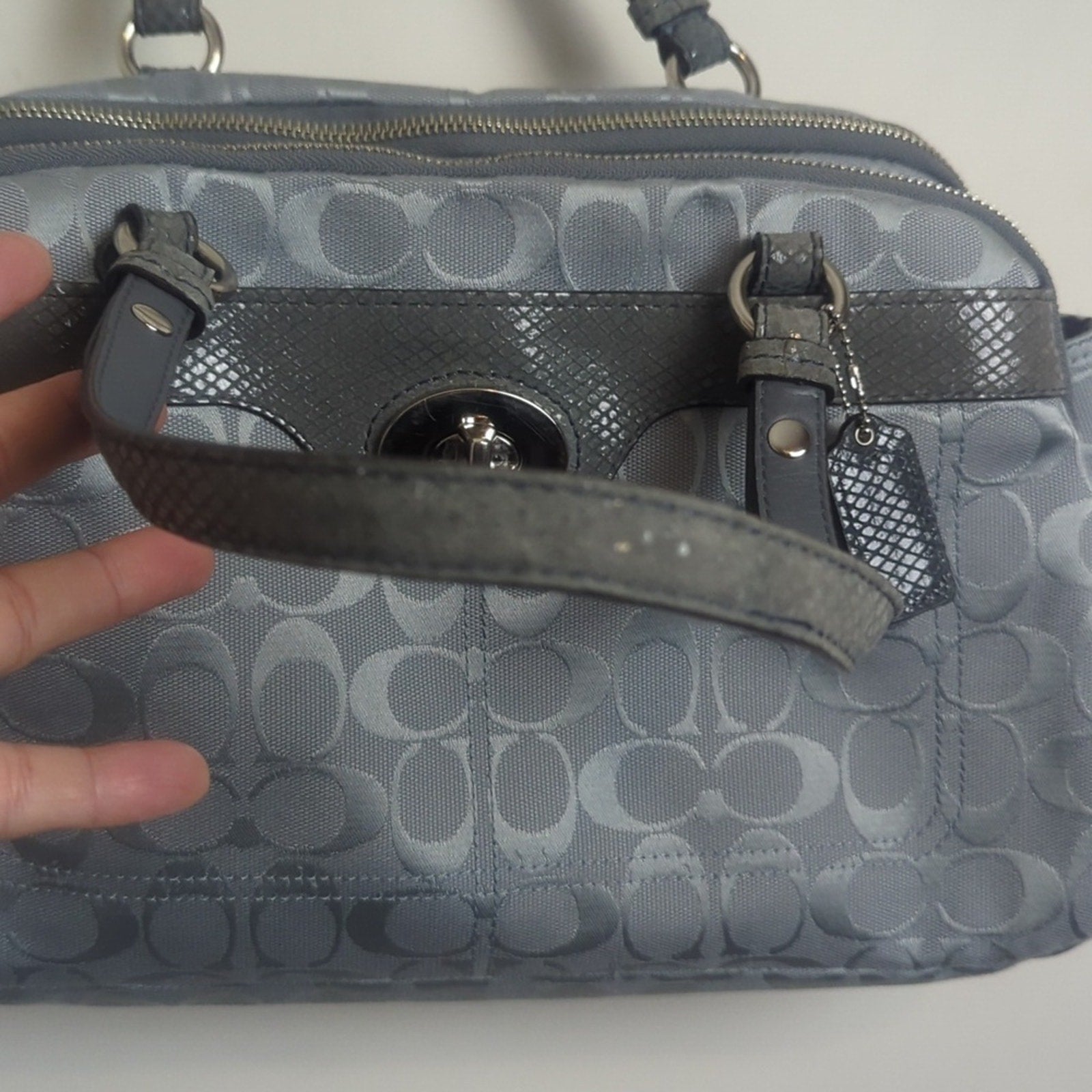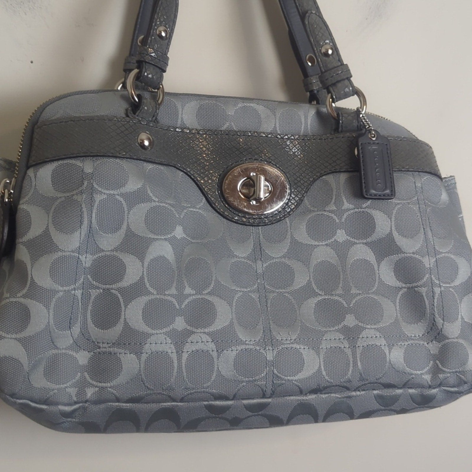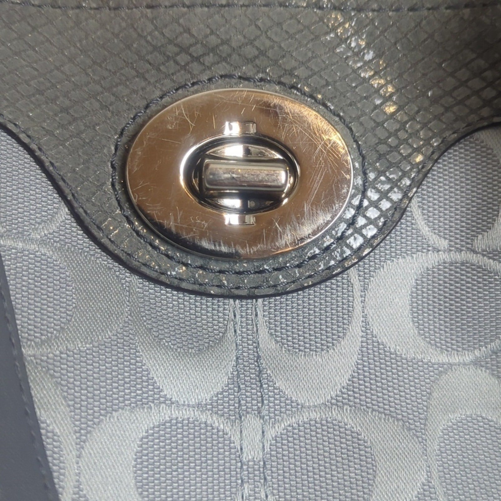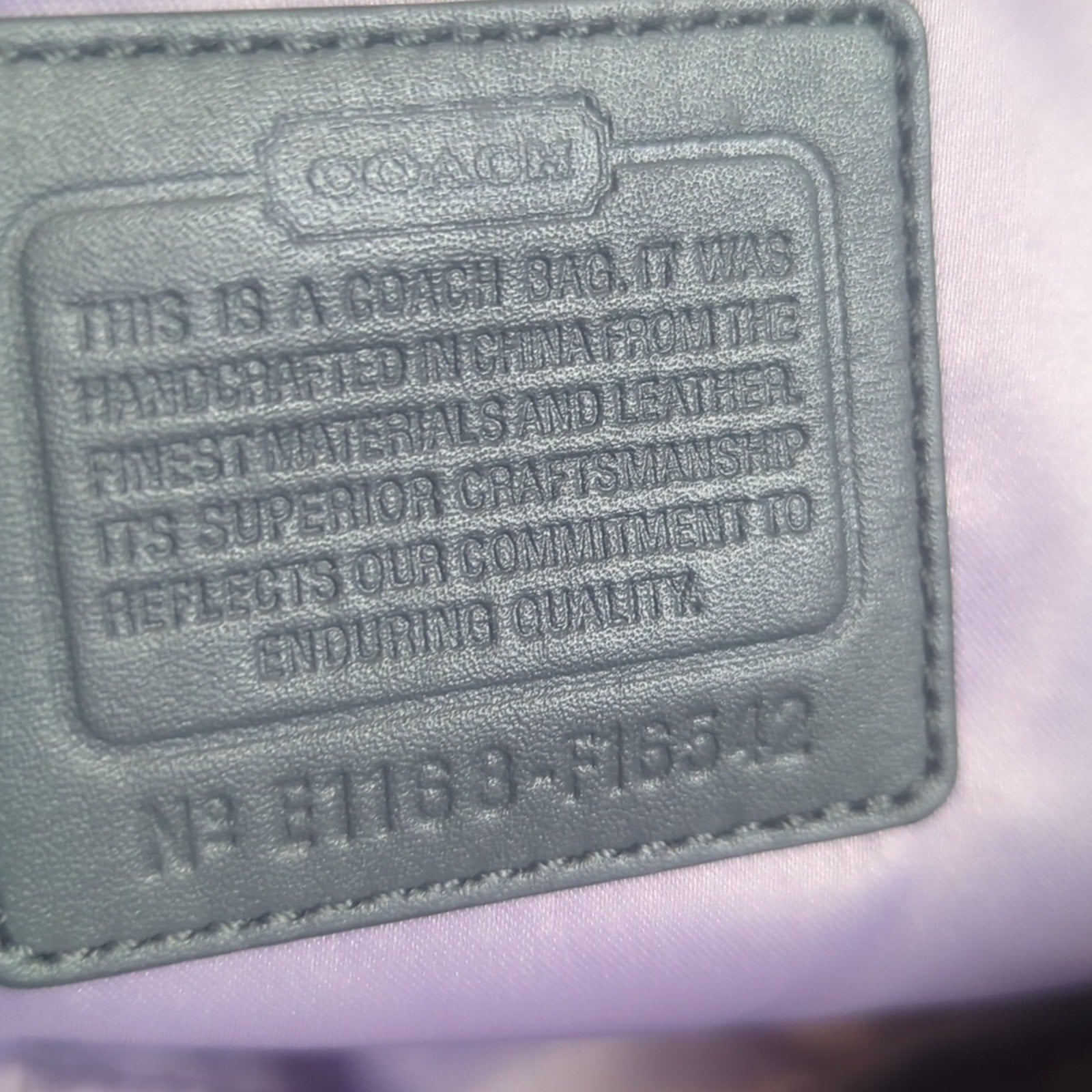 Great condition!! Classic Coach bag with purple interior on the two zipped sides! the center and outer compartment pockets are dark grey.