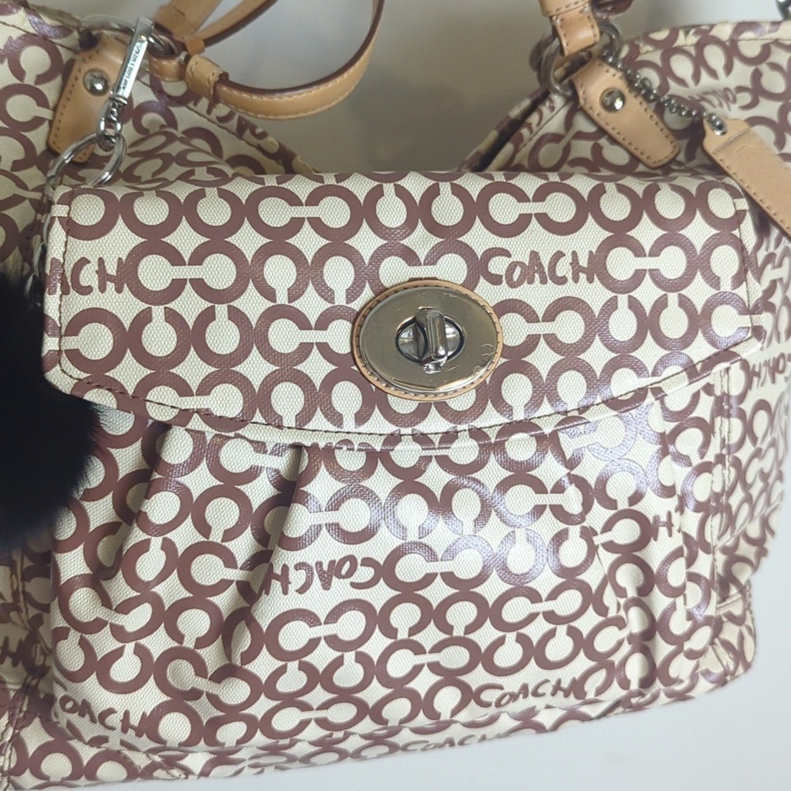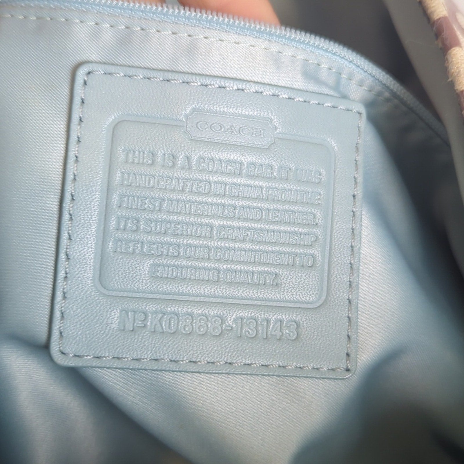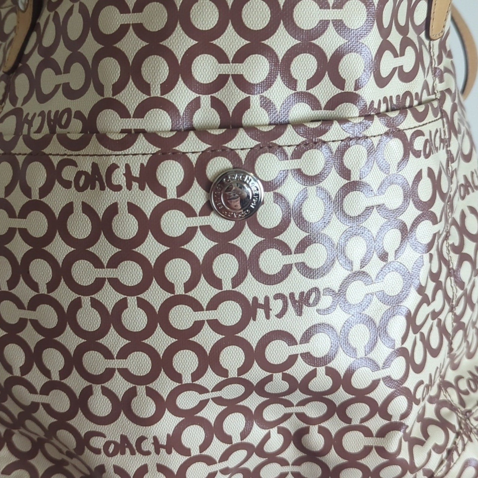 One snap pocket on the outside, toggle closure pocket on the other side. Large inside compartments and pockets! 2 Coach bag charms.