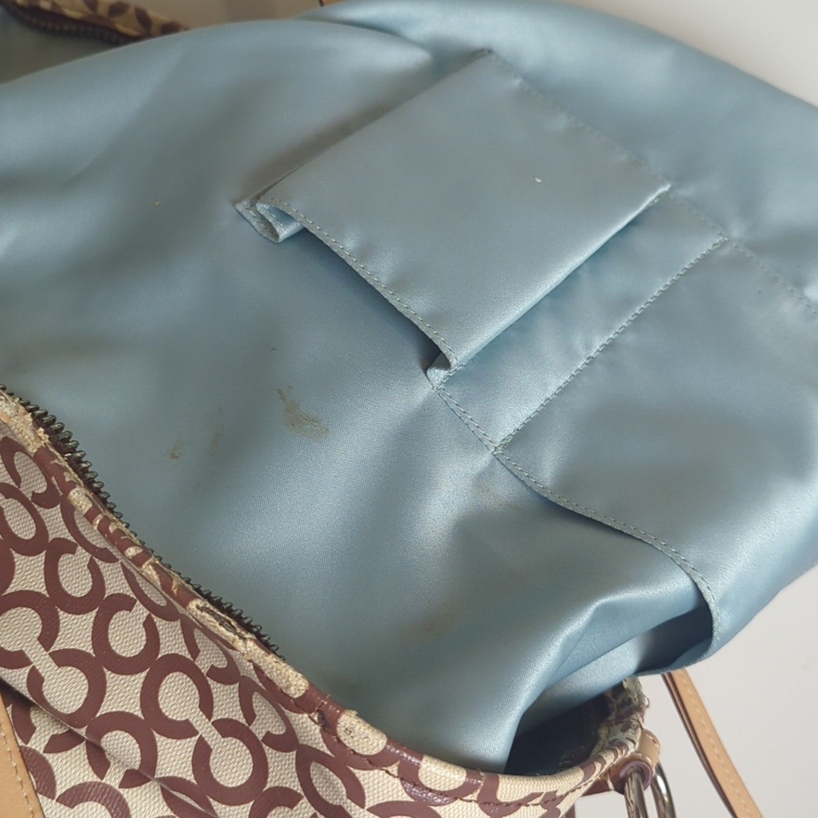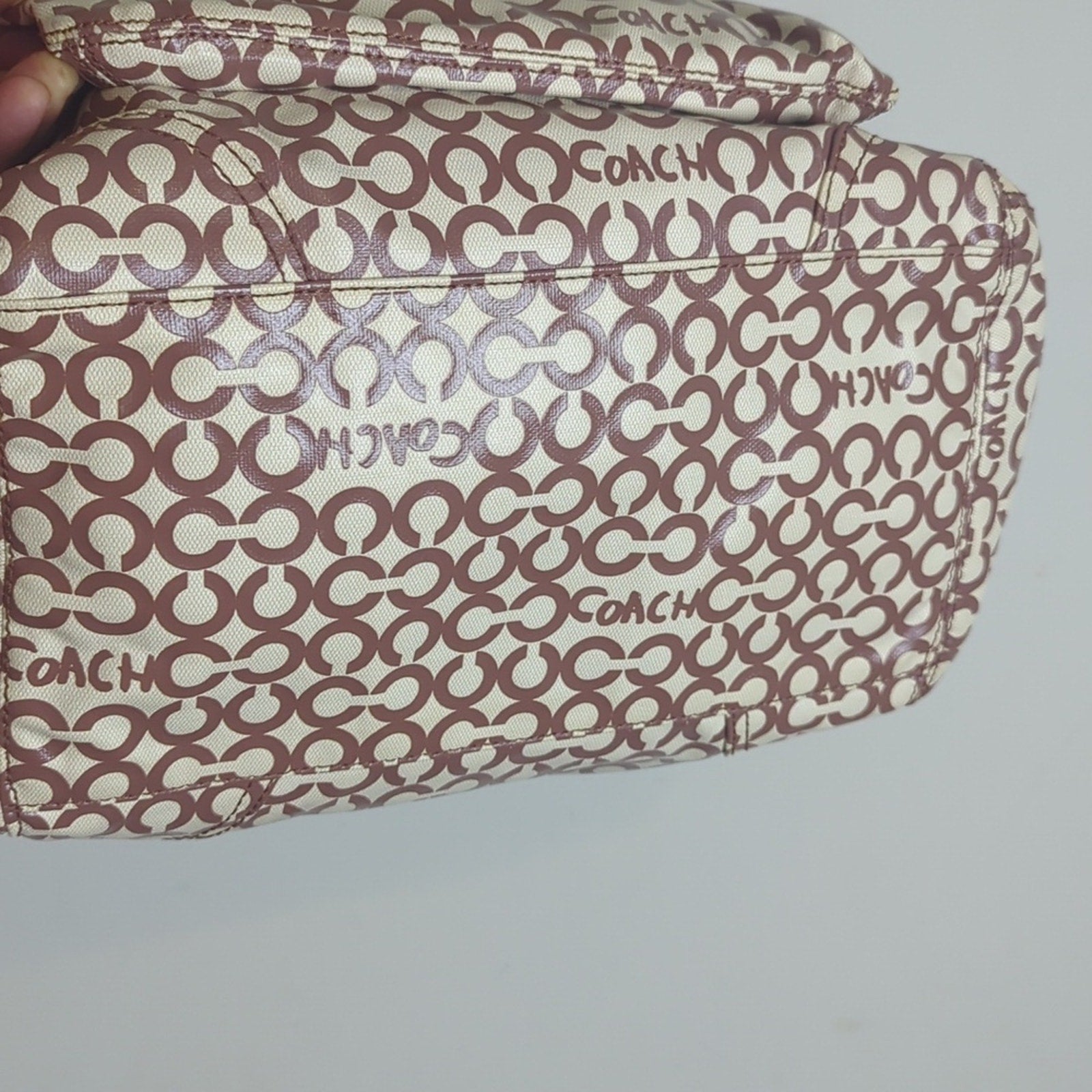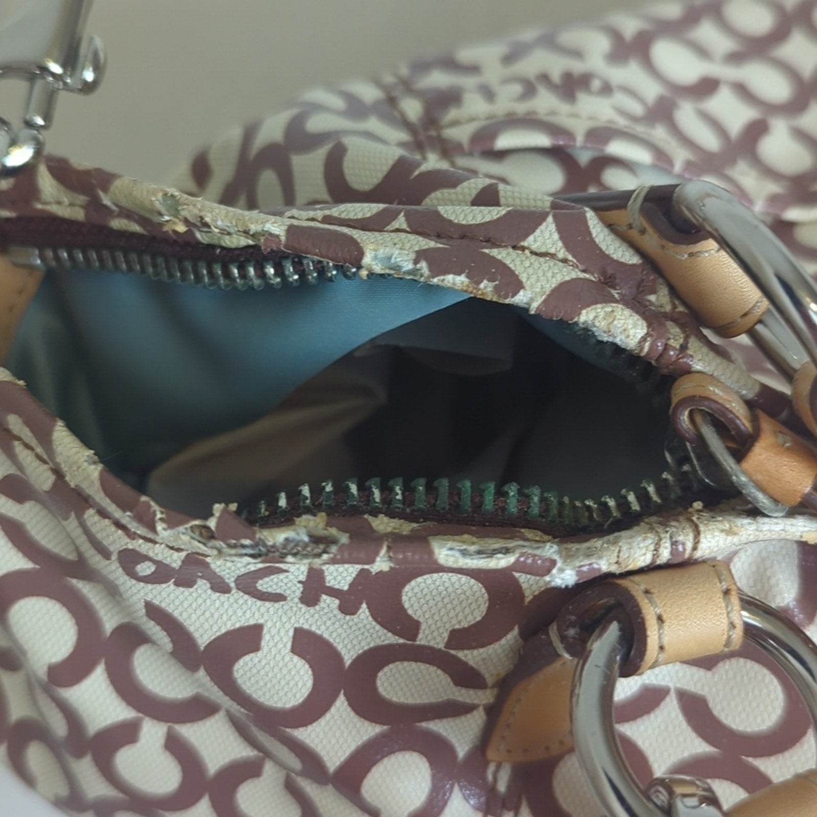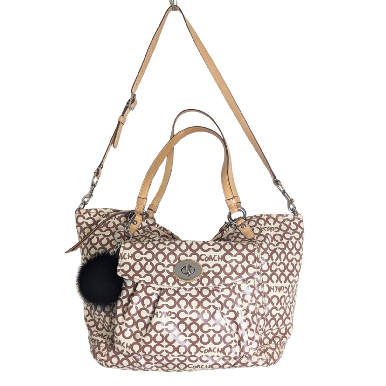 One snap pocket on the outside, toggle closure pocket on the other side. Large inside compartments and pockets! 2 Coach bag charms.