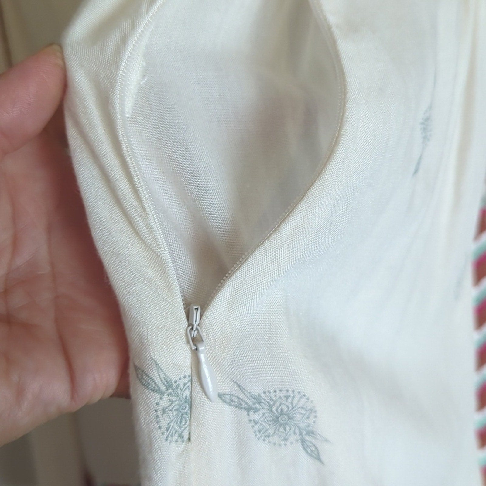 beautiful heavily embroidered baby doll style dress deep the neck with 3/4 sleeves, side zipper closure. minimal wash wear.