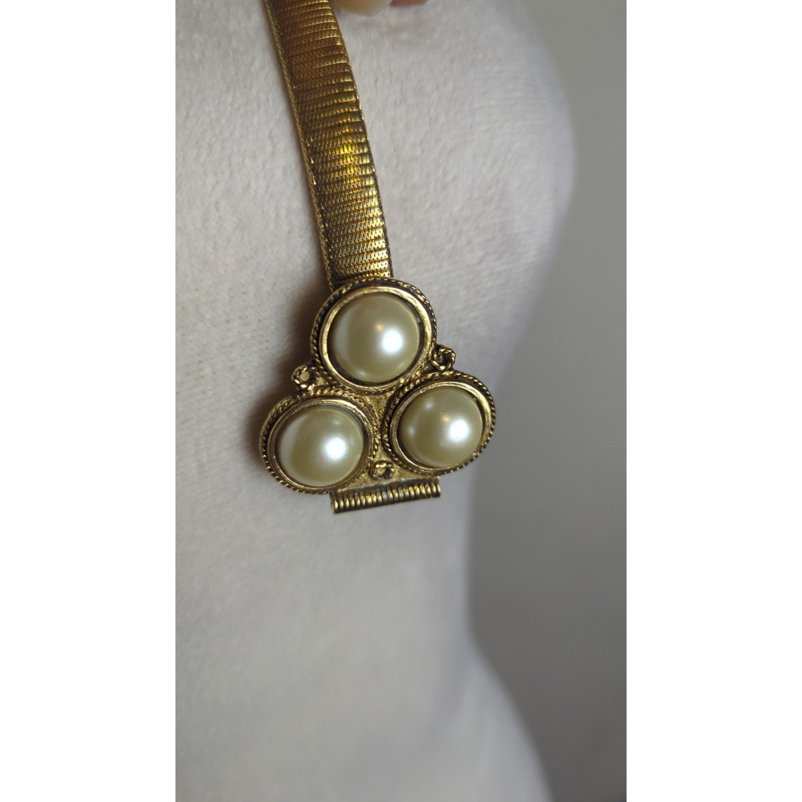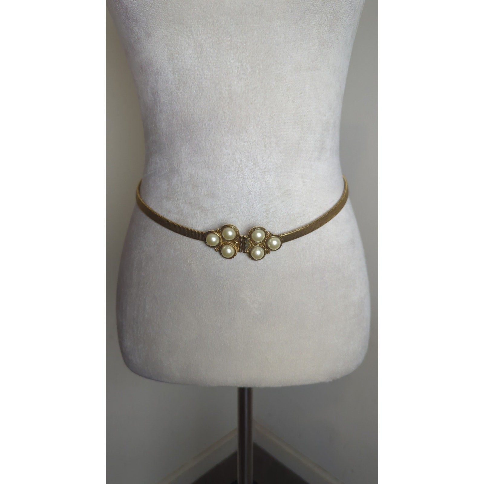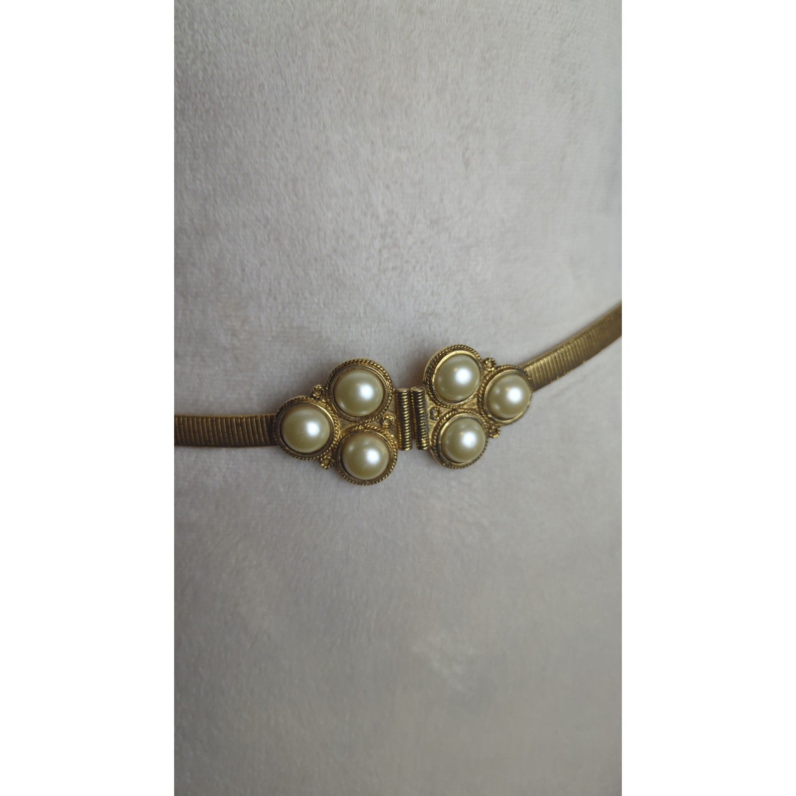 This gold collar belt with pearl like embellishments made in the '70s could be worn as a high-waisted belt or hip huggerer.